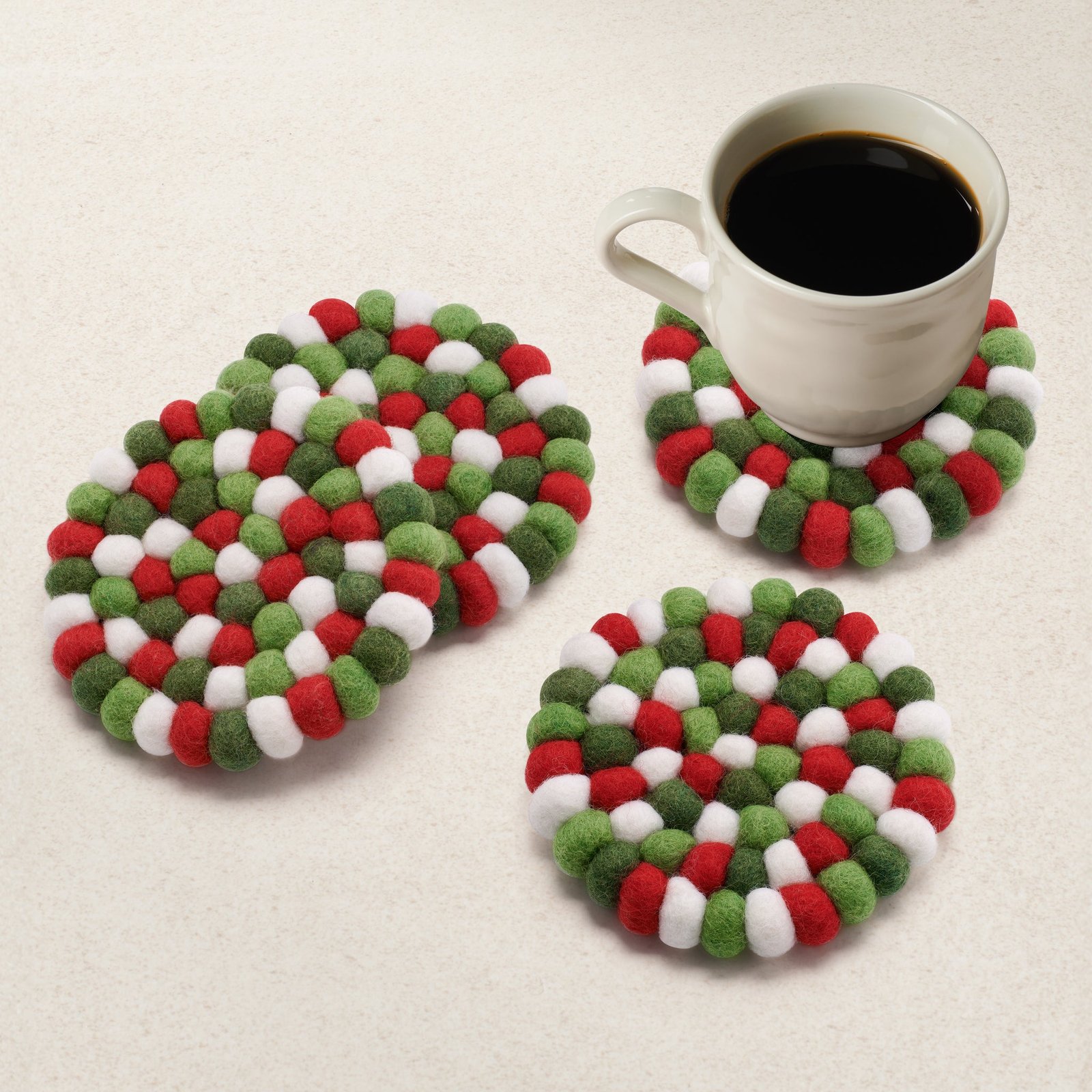 MODWOOL Felt Ball Round 4 In Diameter Coasters S/4 – Red/White/Green