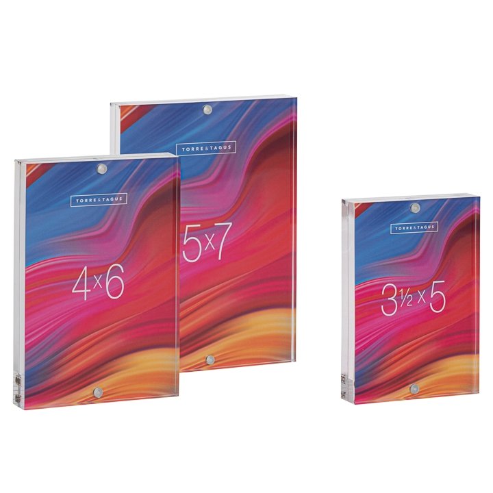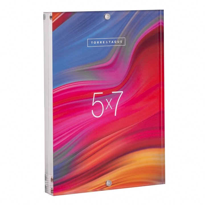 Create a fresh and stylish display with this contemporary acrylic reversible photo frame. Perfect for your desk mantel or bookshelf this unique design holds two images and utilizes a magnetic closure for a seamless look. The ultra clear acrylic provides the same modern clean look as glass without the hazard of shattering and is perfect for everyday use. Fits any size photo up to 5×7″ and can be used vertically or horizonally. Dimensions: Photo size. 5 x 7″. Frame size. 5 x 0.75 x 7h