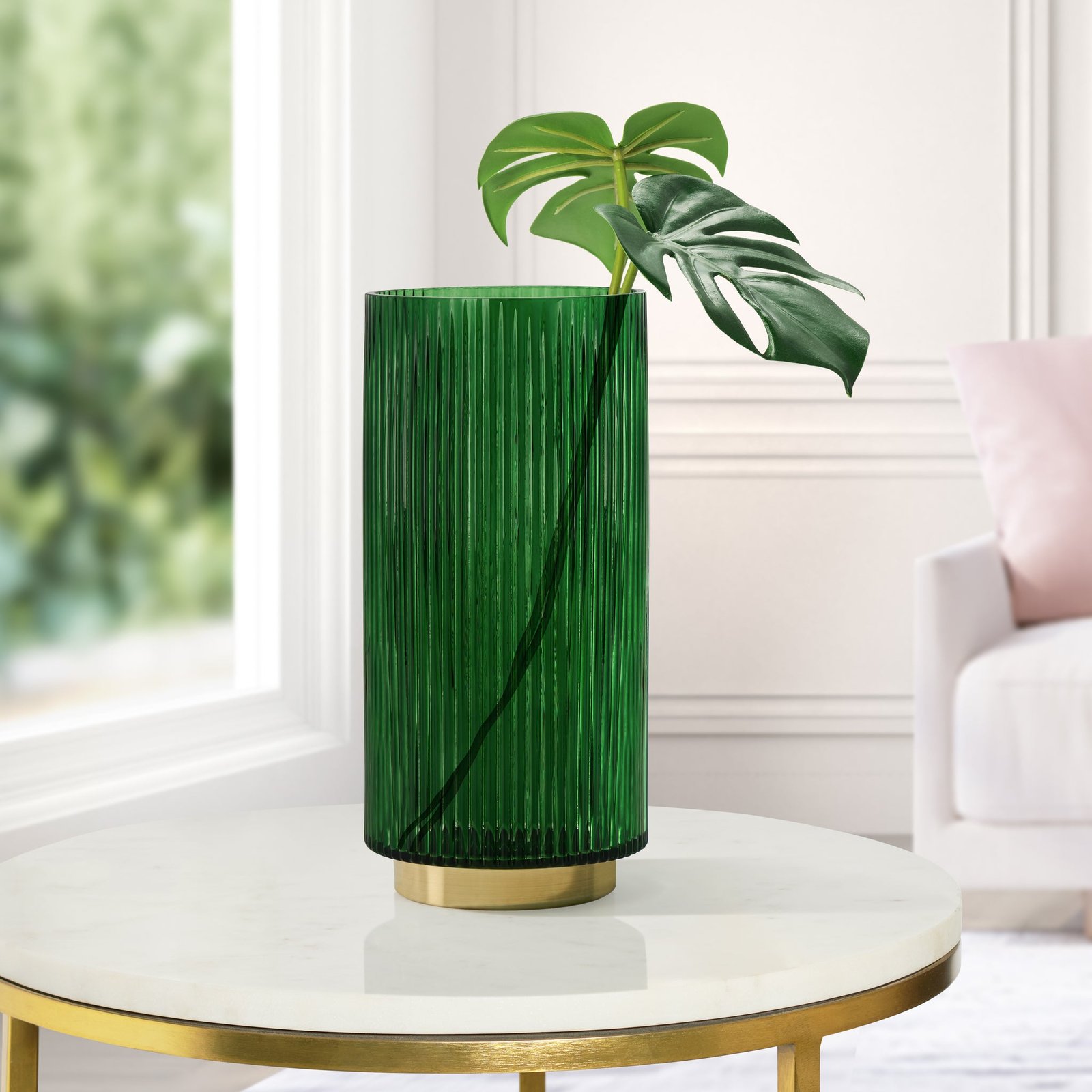 Enhance the elegance of your living room or dining room with our ribbed textured glass cylinder vase featuring a gold metal base. The green color glass adds a modern sophistication while the ribbed texture creates a visually captivating aesthetic. Perfect for showcasing bouquets this vase can serve as a stunning centerpiece or be placed on a shelf effortlessly blending modern and contemporary design elements to elevate the style of any space with its luxurious and elegant appeal. Dimensions: 4.5d x 10h