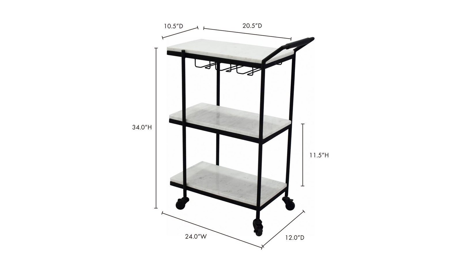 The Midnight bar cart is guaranteed to be a hit at your next hosting occasion.?This dining?room showstopper has a traditional style with a touch of retro glamor. Featuring three?white marble shelves housed within an iron frame this cart allows you to store your favorite drinks glassware and cocktail accessories and to serve your guests in style.. Dimensions: