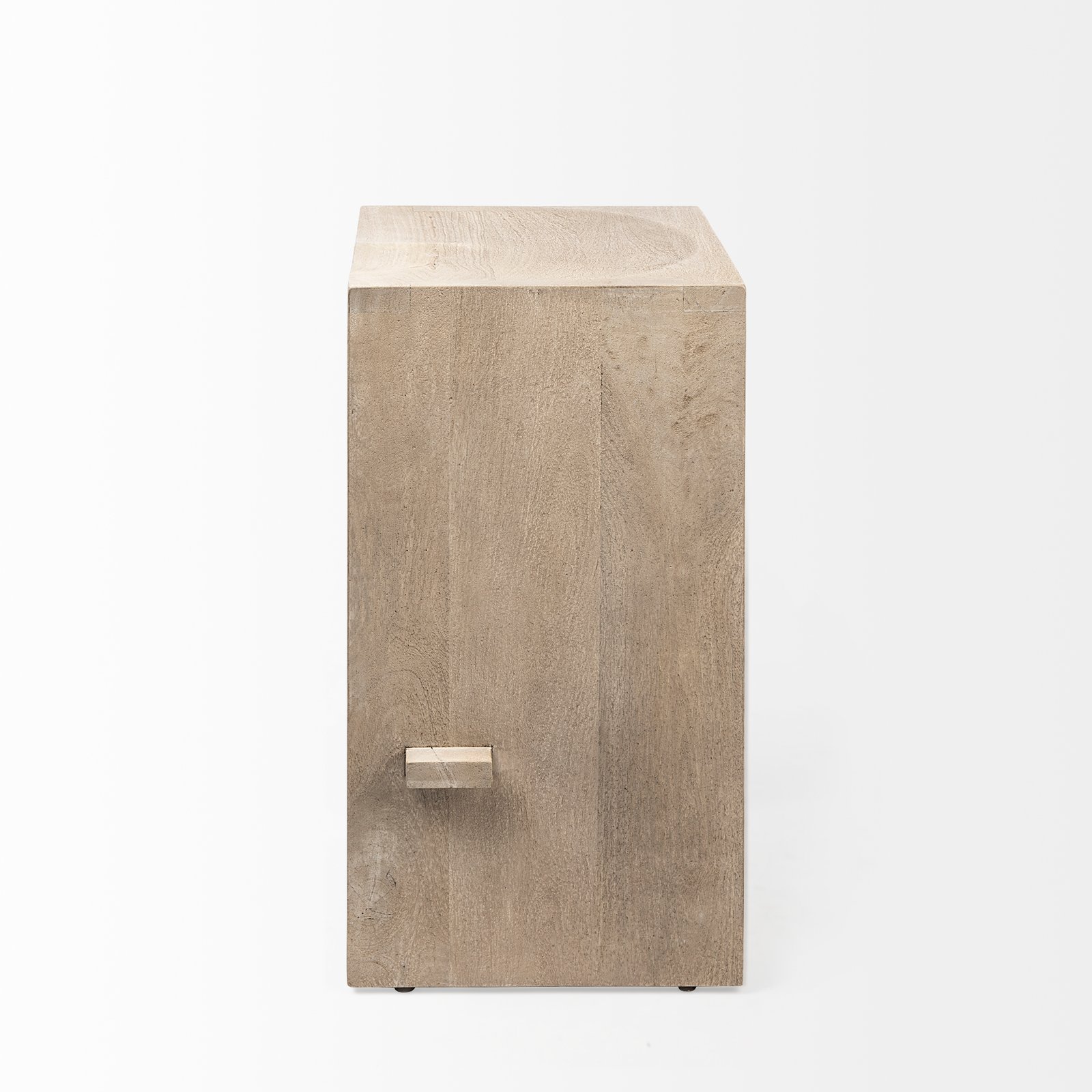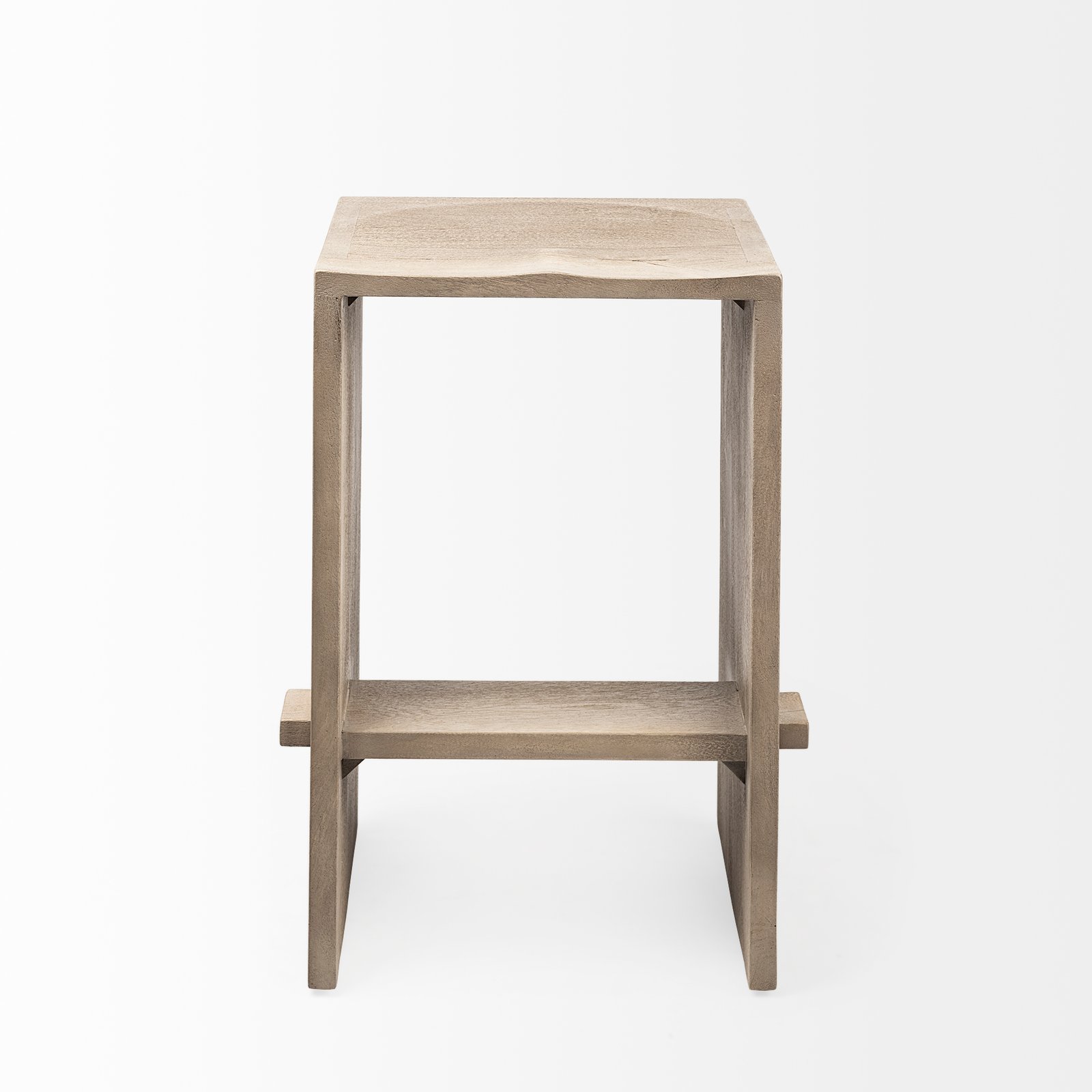The Aida Collection is a contemporary transitional addition to any living space. The rectangular shape counter stool is crafted of durable Indian mango wood finished in a light gray tone and fine sandblasted to feature a subtle texture.? The stool features 2 wide plank legs with foot rest that protrudes through each side that make this piece unique and sturdy.. Dimensions: 16.0L x 14.0W x 26.0H