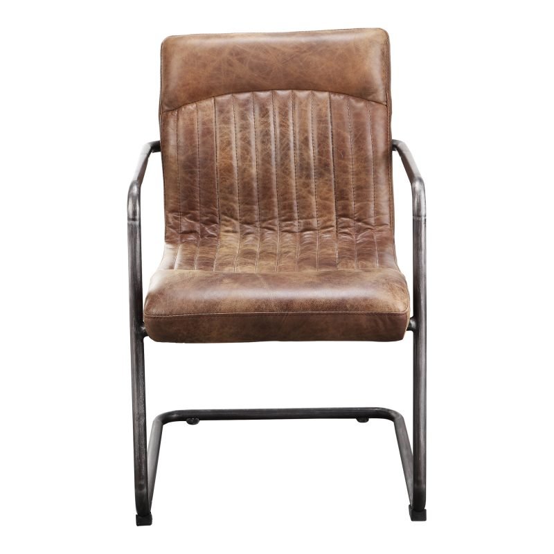 The Ansel dining chair features an industrial iron frame and easy-to-clean distressed top grain leather upholstery. The perfect chair for adding some originality and industrial design to your home. Outfit your entire table with this simple yet stunning design. Available with arms or without as a dining chair.. Dimensions: 21.75? W X 24.0? D X 33.0? H