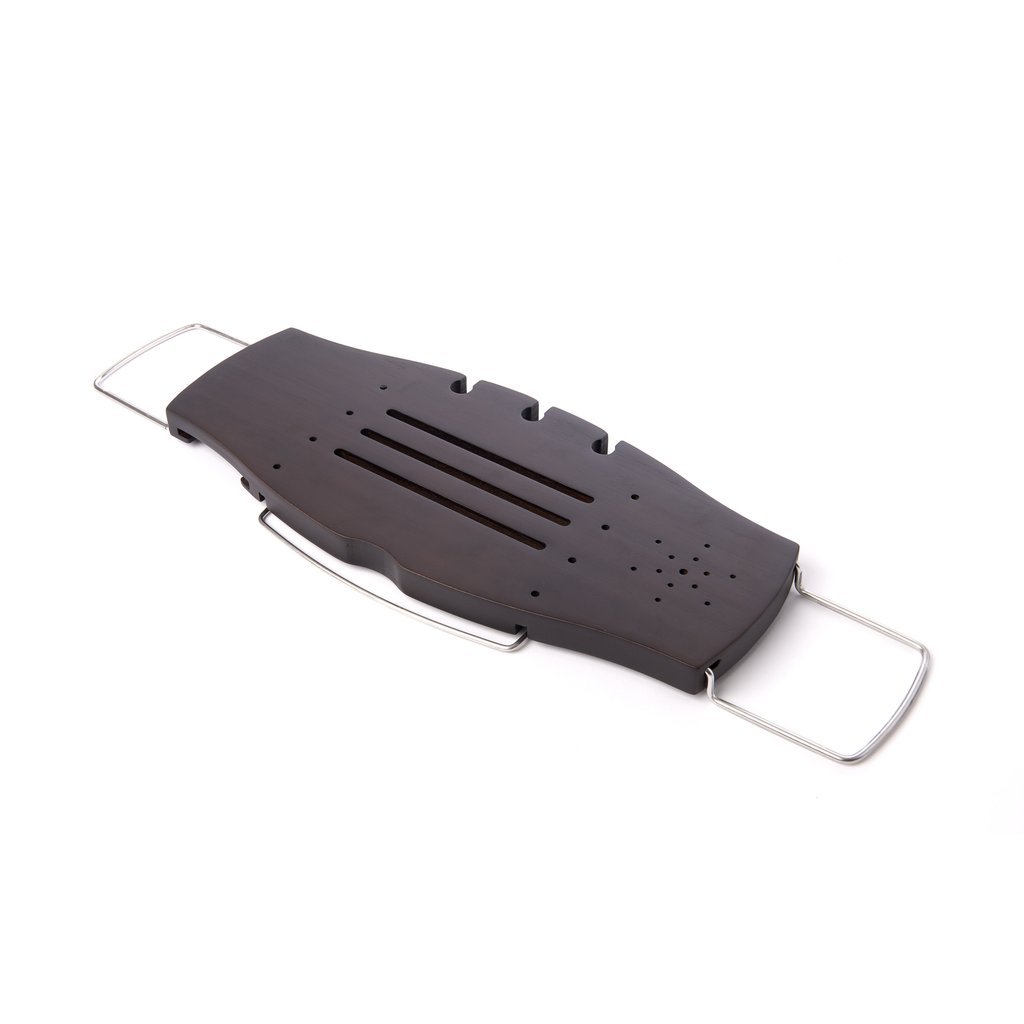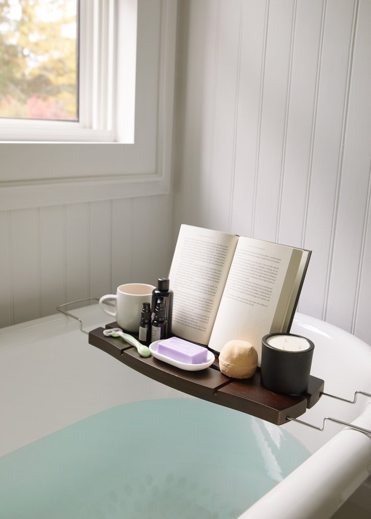 Umbra Aquala Bath CaddyInspired by the technology people use during their leisure time Aquala was redesigned to accommodate the growing needs of our modern customer. The Aquala Bath Caddy is luxury in its simplest form. The new iteration of the caddy keeps your essentials on hand and fits books tablets phones glasses (including stemware) of different sizes. With an added phone holder to keep your phone dry and easily accessible a double hook for your loofah added support to prop up your magazine book or tablet and a new wine glass holder this bathtub caddy will keep all of your bath essentials organized to ensure a tranquil time of relaxation. Dimensions: 28.13″ (71cm)L x 8.63″ (22cm)W x 1.25″ (3cm)H