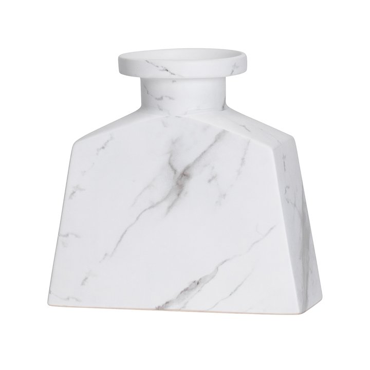 Add drama and beauty to your space with this stylish marble patterned ceramic vase. With a unique tapered shape this decorative accent is perfect for fresh or faux florals or as a standalone sculptural piece. Place on a shelf or use on table to create a dynamic centerpiece. Dimensions: 9.5 x 4.75 x 9.25h”. Vase Mouth. 3d