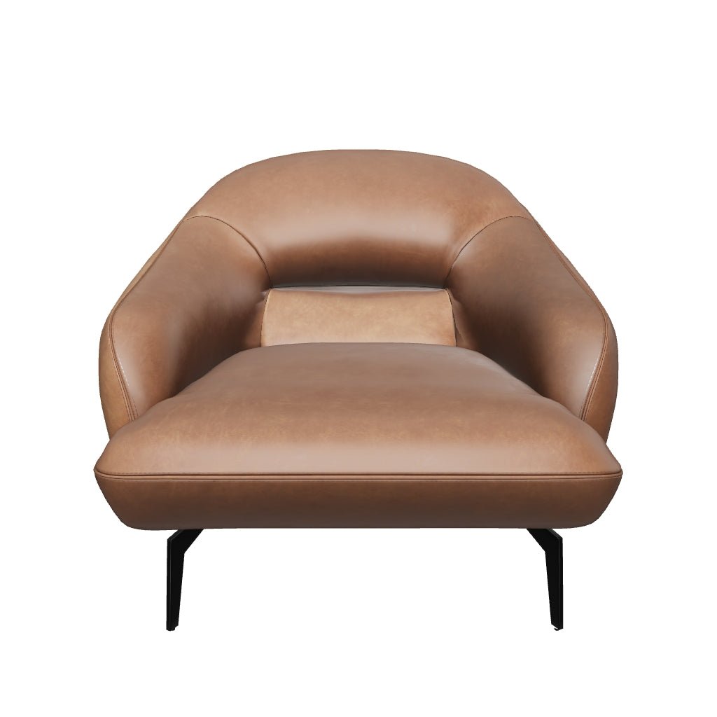 Smooth curves infuse contemporary flair to this Italian-made armchair. Designed for superior comfort with generous cushioned armrests and backrest. Upholstered in a rich cognac 100% Italian bovine leather for exceptional quality that is made to last. This fine material is a natural grain aniline leather that is dyed using traditional methods resulting in consistent and even colouring throughout the piece. Finished with matte black iron legs. Upholstered in high quality full grain aniline leatherSeat and arms made with premium quality loose fibre for plush comfort and support Back cushions filled with multi-channel baffled bags to maintain the positioning of loose fibrefill resulting in well-defined shapes Added comfort and durability with fibre-wrapped high density 2. 0 polyurethane foam cushions Crafted with seasoned timbers for guaranteed frame stability over time Seat suspension made using webbing Made in Italy using FSC certified wood Leather is a natural material. As such colour variations markings wrinkles grooves and light scratches as appreciated characteristics. No two pieces are alike. Dimensions: 37″W x 38″D x 33.50″H
