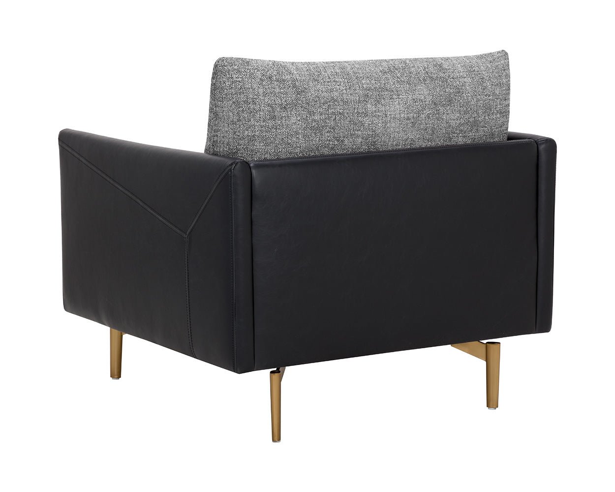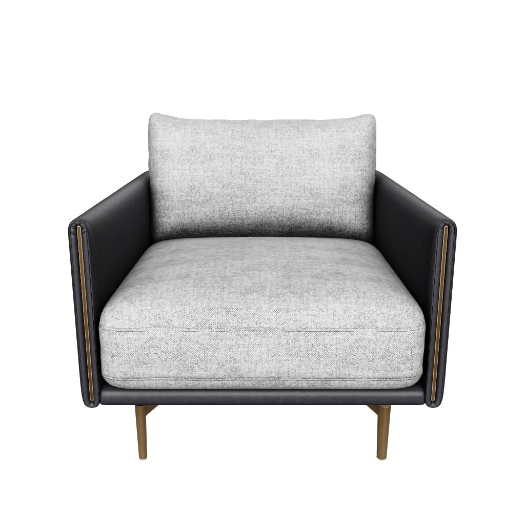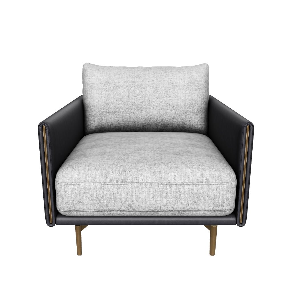 Mixed materials and contrasting colours give the Ashi Armchair an elevated design. Soft cushioning upholstered in nash zebra fabric provides ample comfort. Stitched detailing on the side of the arms gives a subtle geometric design that enhances the coal black faux leather frame. Satin brass aluminum on the legs and trim on the front of the arms ties the look together. Handle With Care: This design has been crafted with faux leather. Faux leather is manufactured to reflect the natural characteristics of leather; as such colour variations markings wrinkles grooves and light scratches are appreciated characteristics. No two pieces will be alike. Visit our Product Care page for more information on how to ensure the lasting beauty of this piece. Dimensions: 34″W x 37″D x 32.50″H