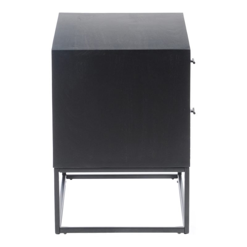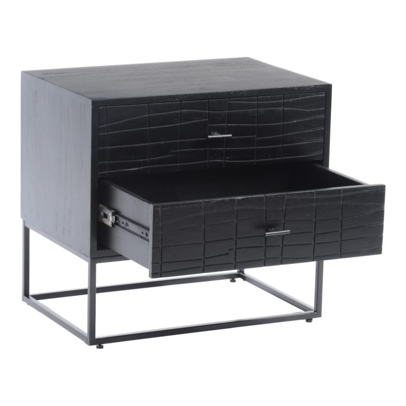 A slick black look. The Atelier nightstand features two sliding drawers with a textured detailing. A cool iron frame supports this minimal stand. The ideal stylish spot for a complementary lamp candle or cup of tea.. Dimensions: 23.5? W X 15.5? D X 21.5? H