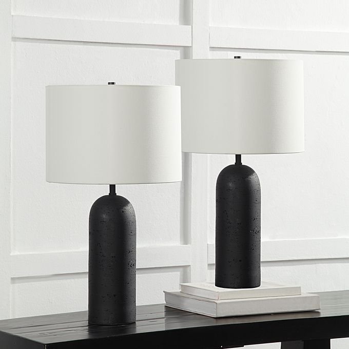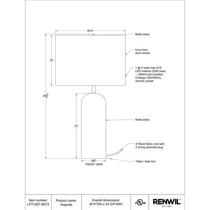 Set of 2Table lampsResinBlack finishIronPowder coated matte black finishIvory linen shadeDimmer switchMax. 100WE26 socketLED dimmable bulbs includedNet Weight: 14.08lbs.Gross Weight: 17.38lbs.. Dimensions: