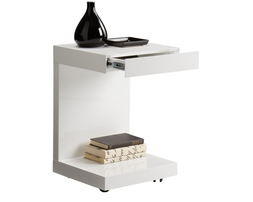 This simple but very functional c-shaped table with drawer can be used with a sofa chair or even as a nightstand. Stocked in high gloss white. Also available in espresso and driftwood. Castors are included. Wheels for easy maneuvering. Sleek hidden drawerWipe clean with a damp clothMinimal assembly Dimensions: 16″W x 16″D x 23.50″H