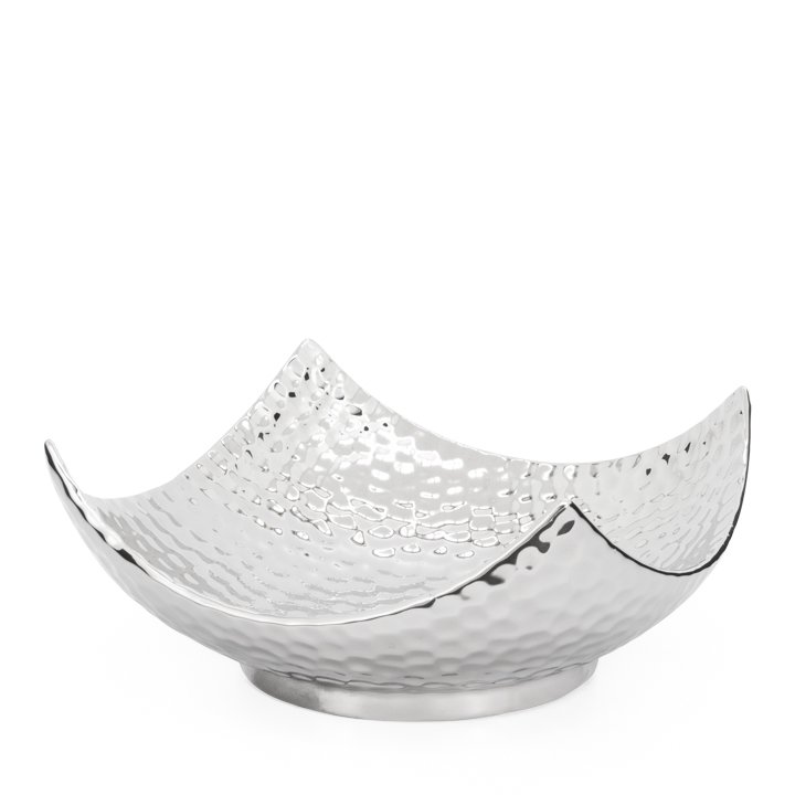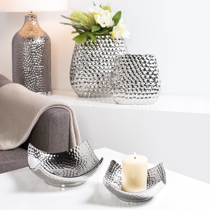 Electroplated ceramic pieces with a unique hammered texture. Dimensions: 9 x 9 x 4h”