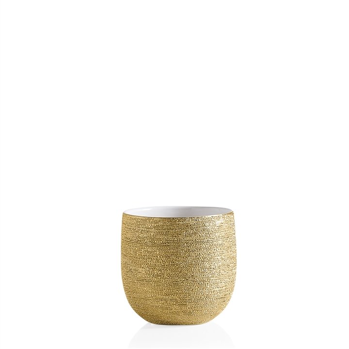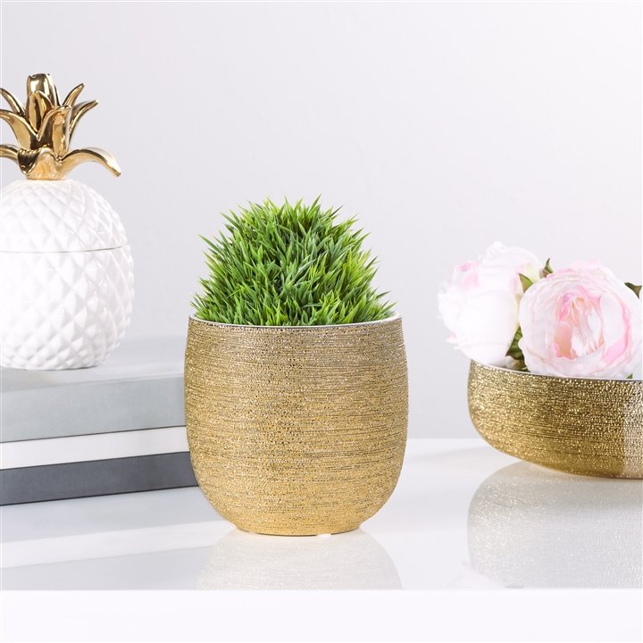 This modern textured metallic ceramic planter is perfectly balanced by a smooth white glaze inside making it a wonderful decorative addition to any home or office. The contemporary yet classic design blends seamlessly with any decor style in the living room or bedroom and can be pre-potted or faux plants on a shelf or table to add a touch of drama and beauty. Alternatively fill with fresh cut flowers to create a standout centerpiece on the dining table or at your next event. Perfect for weddings or as a holiday accent the gold sparkle will showcase floral arrangements beautifully. Dimensions: 5.25d x 5.25h”. Inside Dimensions 4.5d