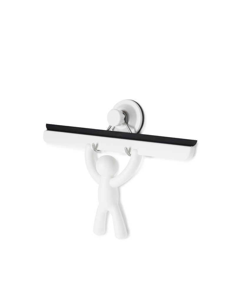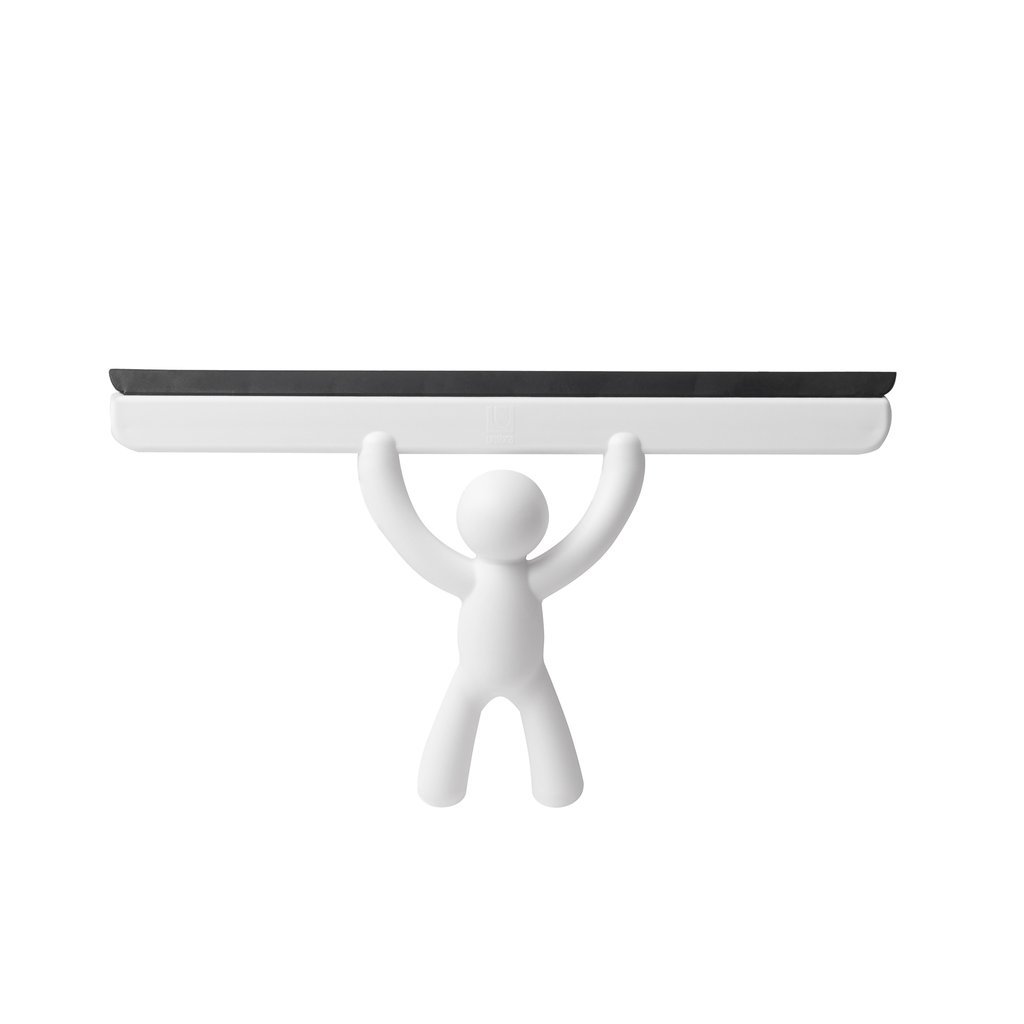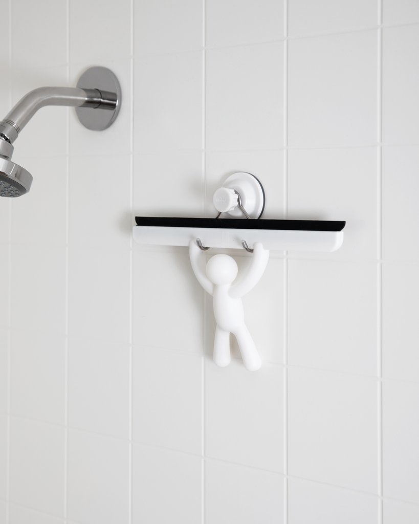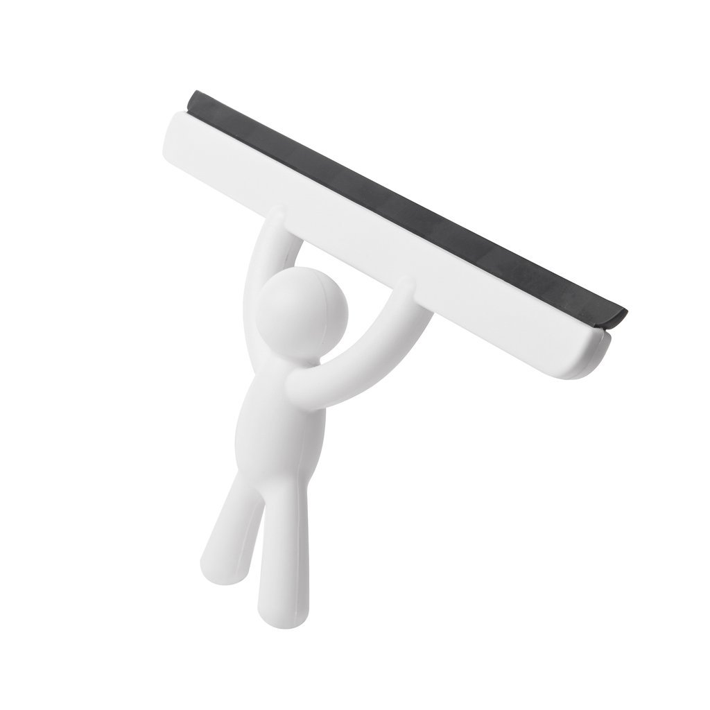 Umbra Buddy Shower SqueegeeThe Buddy Squeegee is a fun twist on a tedious task; the creativity of its design makes the process more enjoyable. Constructed with features like durable white polypropylene anti-rust technology and a streak-free flexible silicone blade this product maximizes efficiency and practicality. Buddy measured at 10.5 x 6.25 x 2 inch (26.7 x 15.9 x 5.1 cm) is designed to be compact and practical amplified by sure-lock technology to create a tight suction cup hook on the back to easily hang the product and ensure a strong grip. Buddy cleans glass surfaces and wipes away fog in addition to removing any general buildups on shower walls. Dimensions: 10.12″ (26cm)L x 7.38″ (19cm)W x 1.63″ (4cm)H