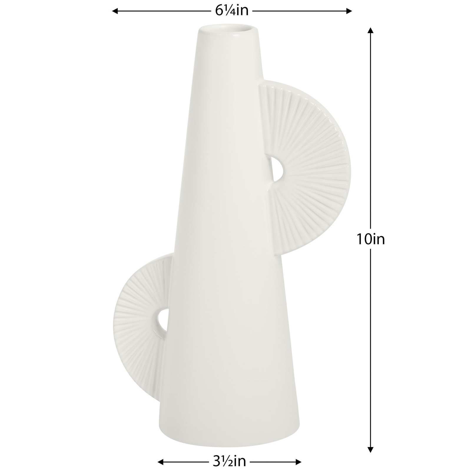 This sleek and modern two-tone ceramic vase is a perfect addition to any contemporary living space. The matte white finish is enhanced with shiny white decorative circular accents creating a unique and gallery-inspired look. Whether used to showcase a single stem or displayed on a shelf or table this vase is sure to add a touch of sophistication to any room. Dimensions: 6.25 x 3.5 x 10h