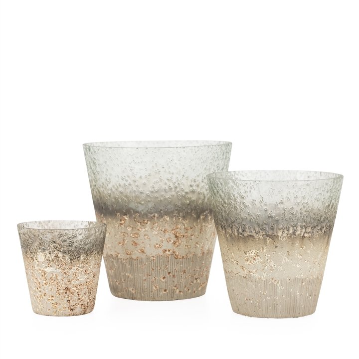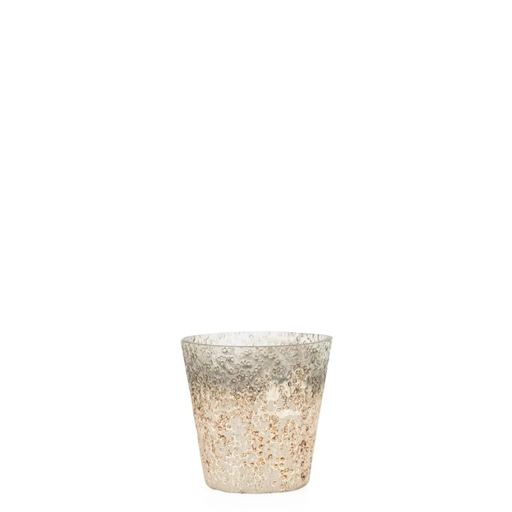 This glass piece will look stunning in any home as either a vase drop pot planter or candle holder. The gorgeous ombre gold and smoke finish is highlighted by molten rock-inspired hammered details for a unique look. Dimensions: 4d x 4h