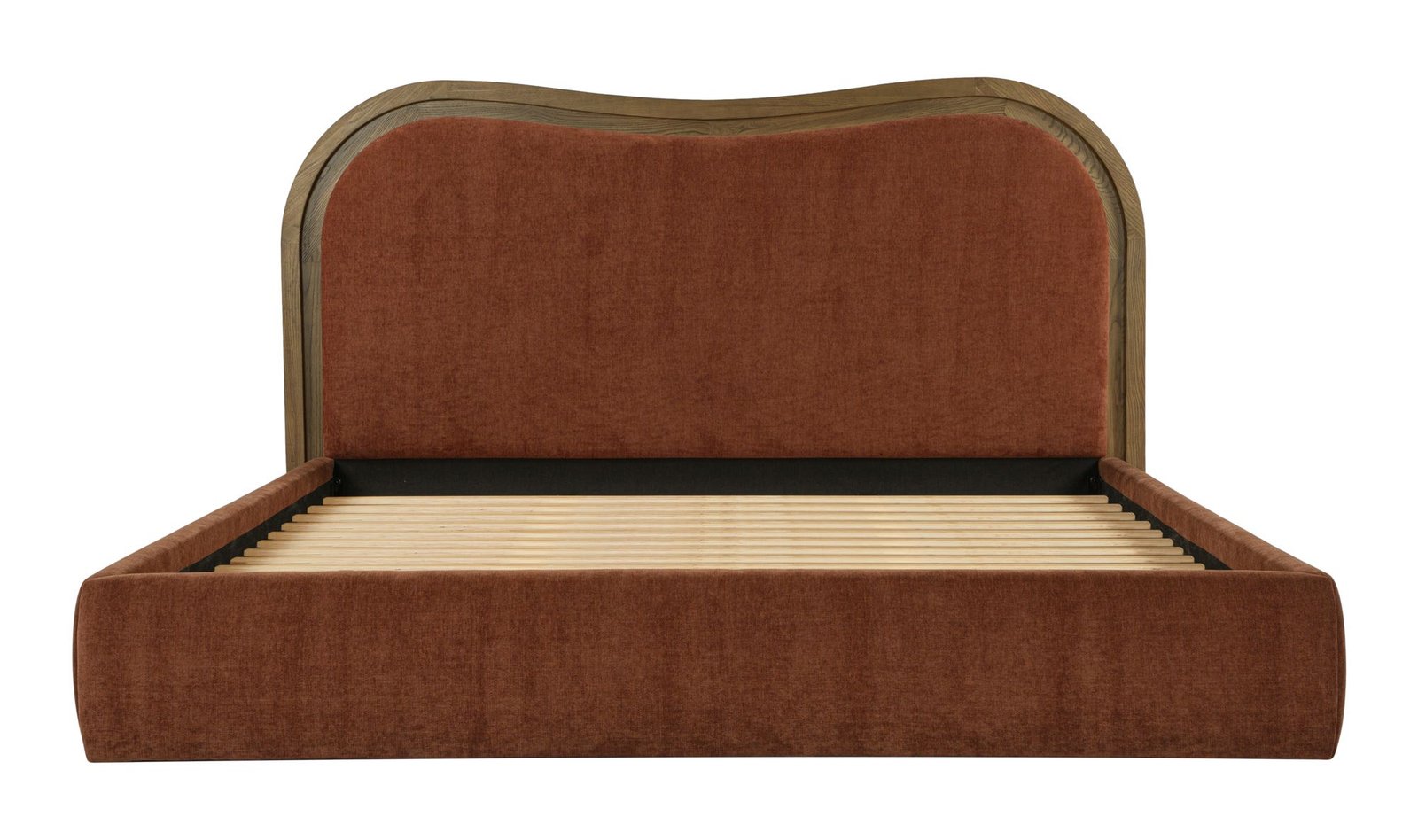 The Camilla bed is our art deco-inspired take on the wave bed. Its solid ash frame exudes warmth with its vivid chestnut color. The upholstered foam and fiber headboard is thoughtfully designed featuring a stepped-down or inset frame technique that skillfully creates a captivating wave effect.. Dimensions: 73.0? W X 85.0? D X 50.0? H