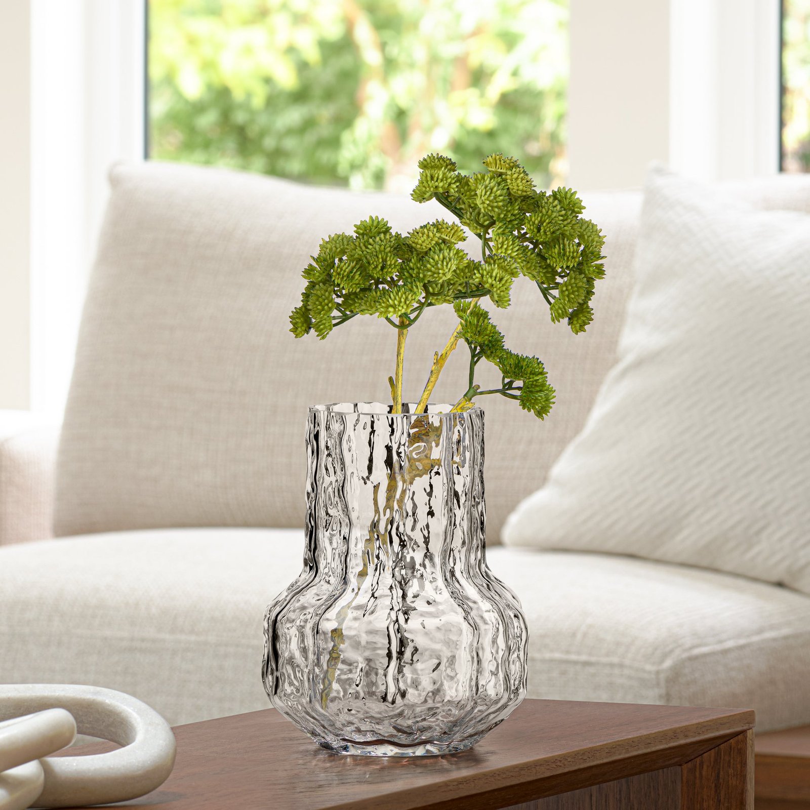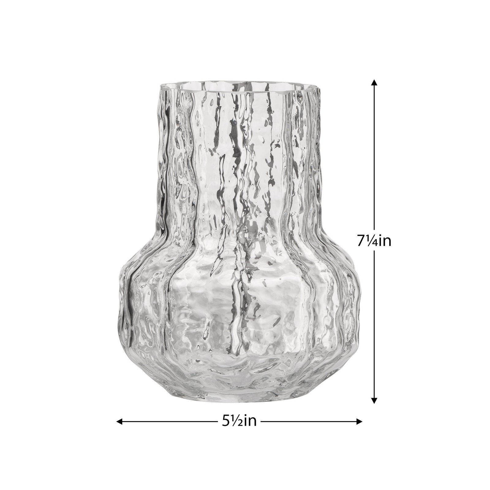 Enhance the charm of your home decor with our clear glass flask vase featuring a unique texture. This versatile vase is perfect for displaying fresh or faux florals adding a touch of natural beauty to any shelf or table. With its modern and designer appeal this charming boho-inspired vase effortlessly blends style and functionality creating a captivating focal point in your space. Dimensions: 5.5d x 7.25h