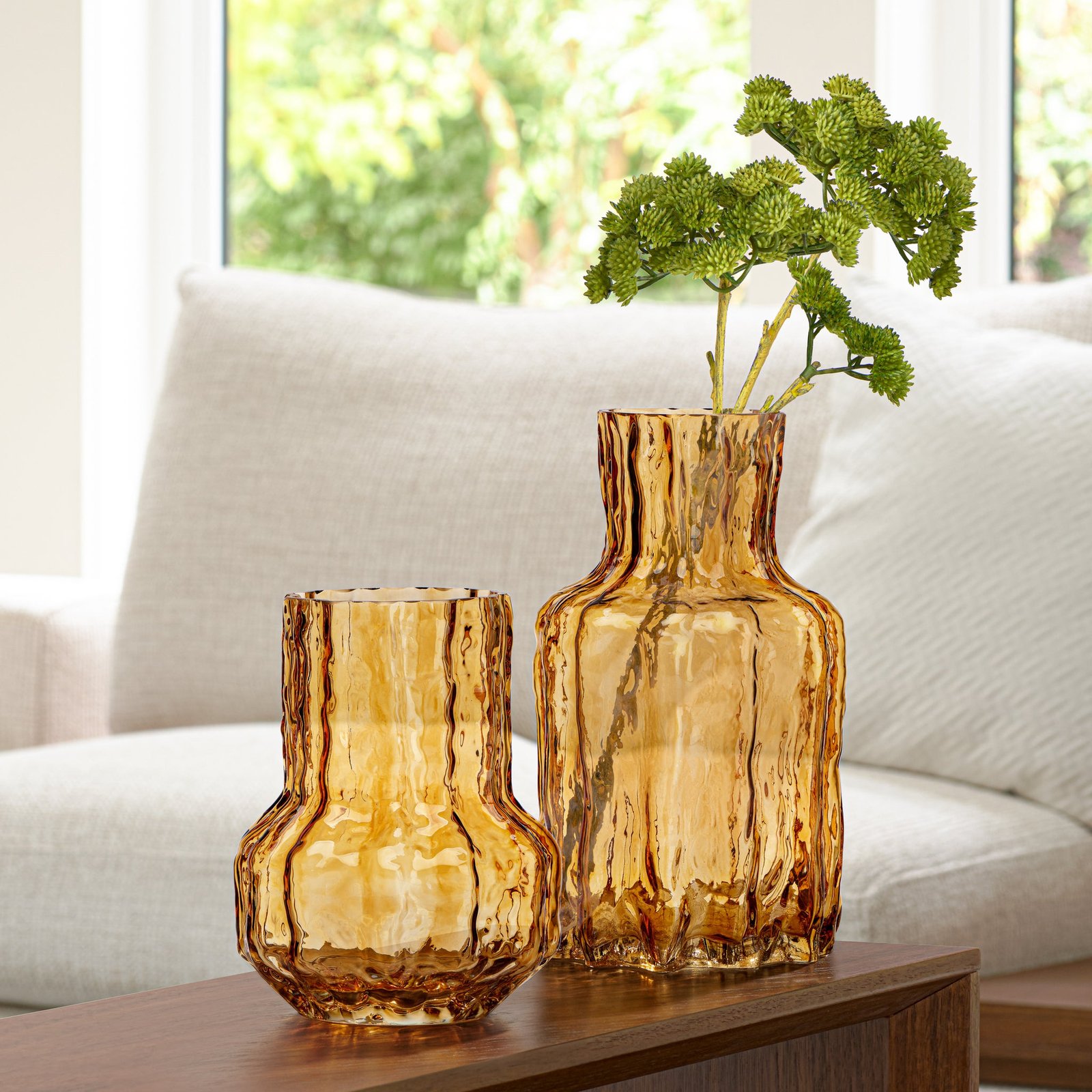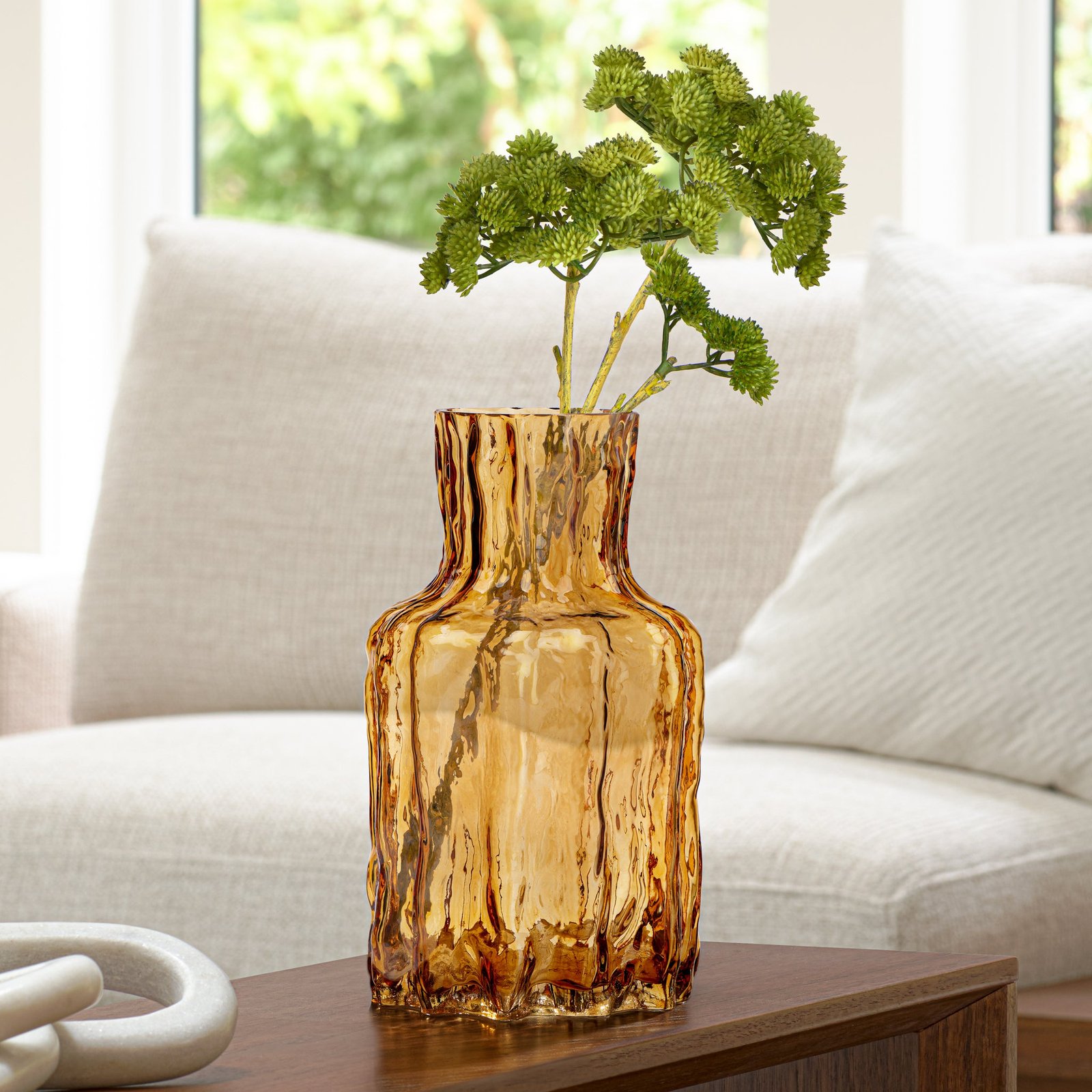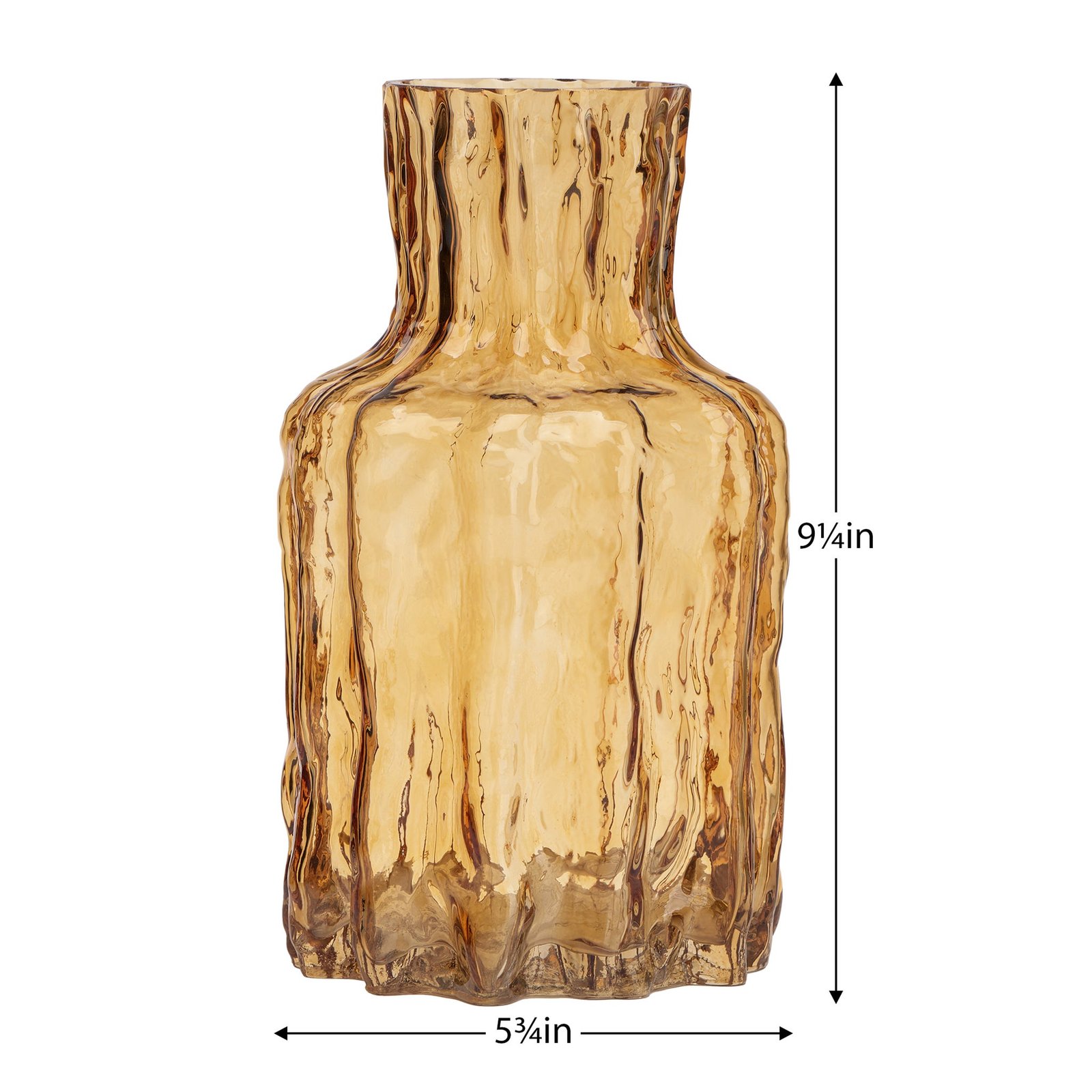 Enhance the charm of your home decor with our amber glass flask vase featuring a unique texture. This versatile vase is perfect for displaying fresh or faux florals adding a touch of natural beauty to any shelf or table. With its modern and designer appeal this charming boho-inspired vase effortlessly blends style and functionality creating a captivating focal point in your space. Dimensions: 5.75d x 9.25h