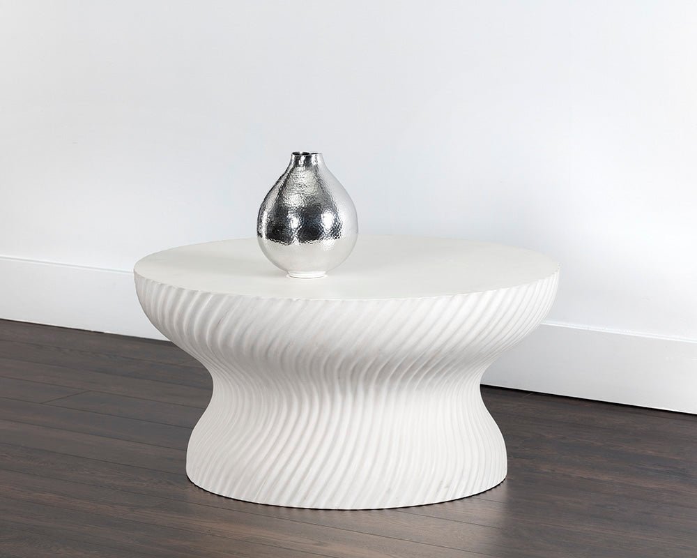 With a mesmerizing shape this round coffee table is well defined by its stunning swirl indentation on the base. Glass fibre-reinforced concrete is incredibly durable and long-lasting. Sealed with a topcoat for added protection against moisture and staining. Finished and sanded by hand. Crafted from a natural concrete mix each piece will look different. Variations in colour texture imperfections surface scratches and non-structural hairline cracks are inherent and valued qualities of concrete. Apply protective covers or store indoors when not in use and during inclement weather to prolong the life of outdoor furniture. Dimensions: 31.50″D x 15.75″H