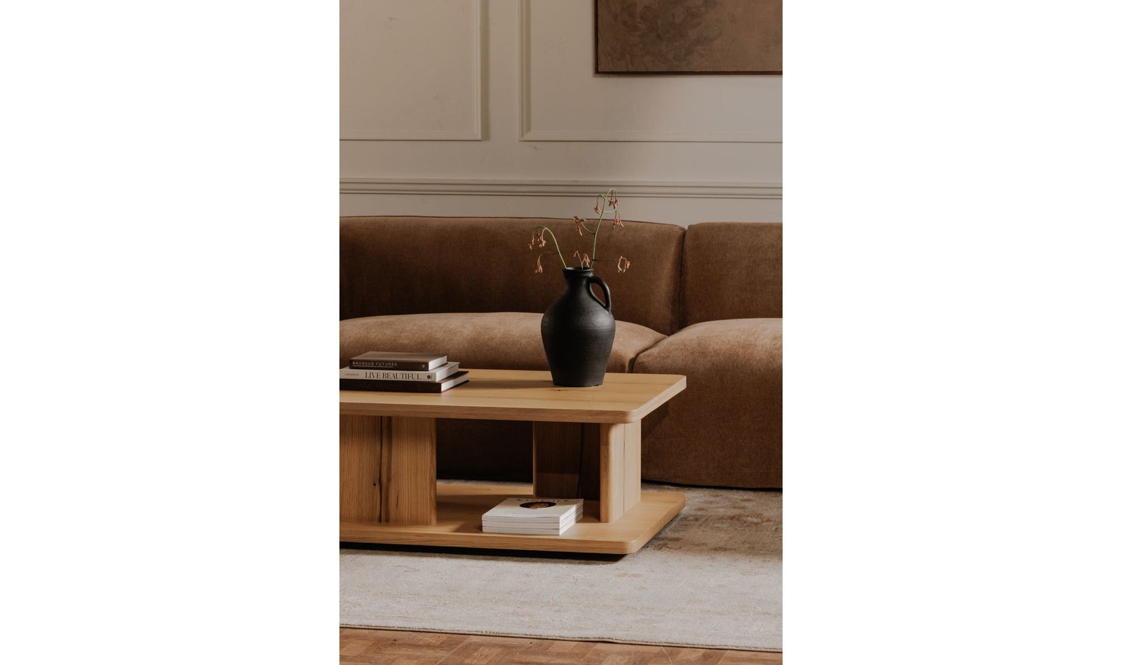 The Casey coffee table harmoniously blends rustic charm with contemporary aesthetics. A distinctive vertical support adorned with a refined bullnose edge adds sculptural grace to its minimalist design. Ample open storage beneath the tabletop offers practical display or storage solutions.. Dimensions: 40.0? W X 30.0? D X 16.0? H