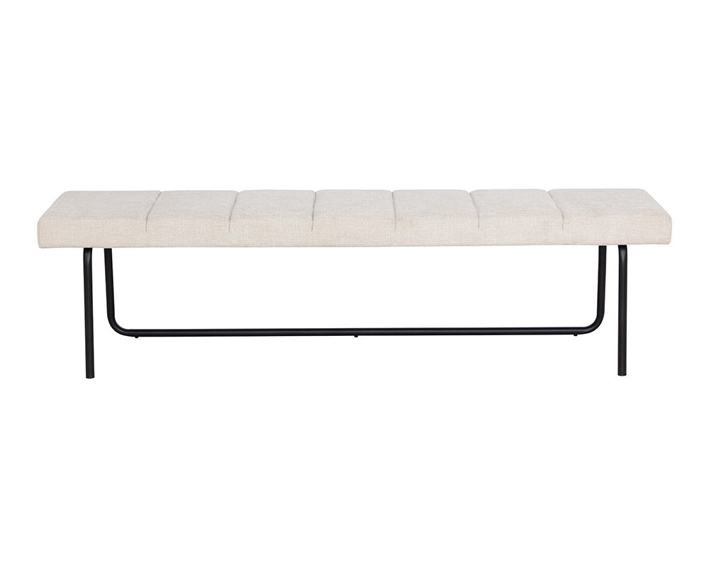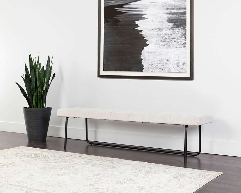 A modern bench that will add function and sleek modern style to any space. Stocked in chacha cream fabric and completed with an alluring matte black powder coated metal base. Dimensions: 70.50″W x 17.75″D x 18.75″H