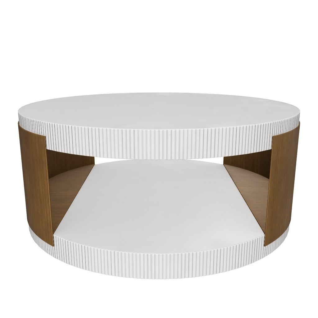The Cavette coffee table combines old world influence with feminine flair. Features a ridged white concrete top and base with a brass steel frame. Glass fibre-reinforced concrete is incredibly durable and long-lasting. Sealed with a topcoat for added protection against moisture and staining. Steel on frame features a durable powder-coated finish. Concrete top and bottom is 80 mm thick. Crafted from a natural concrete mix each piece will look different. Variations in colour texture imperfections surface scratches and non-structural hairline cracks are inherent and valued qualities of concrete. Apply protective covers or store indoors when not in use and during inclement weather to prolong the life of outdoor furniture. Dimensions: 38″D x 16″H