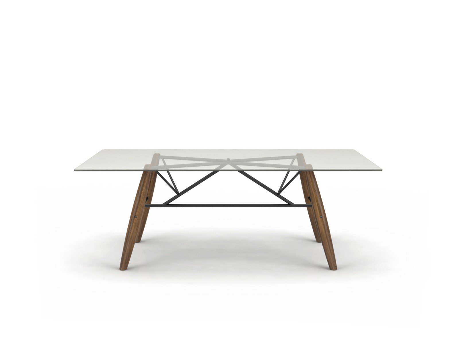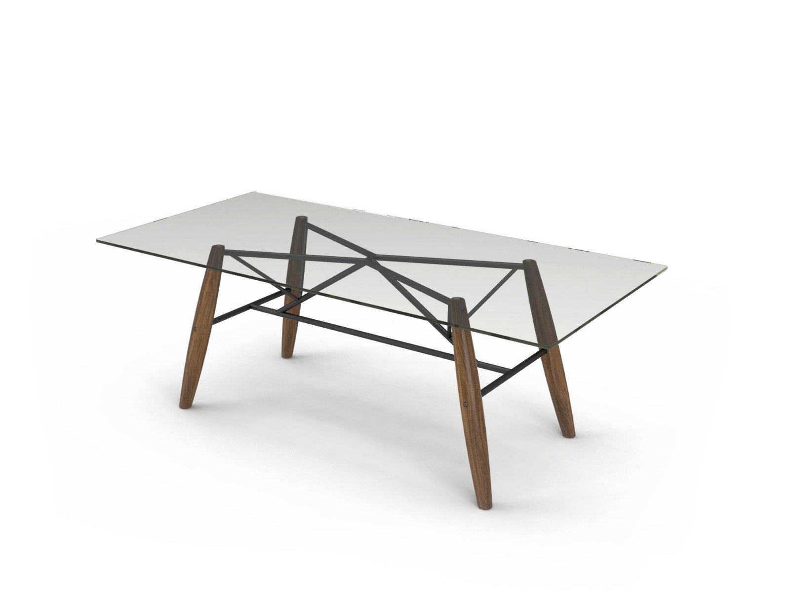 Design: Joel Dupras. Solid walnut legs & lacquered steel frame tempered clear glass top. Available 76” or 84” long. Dimensions: 76″/84″W x 40″D x 30″H