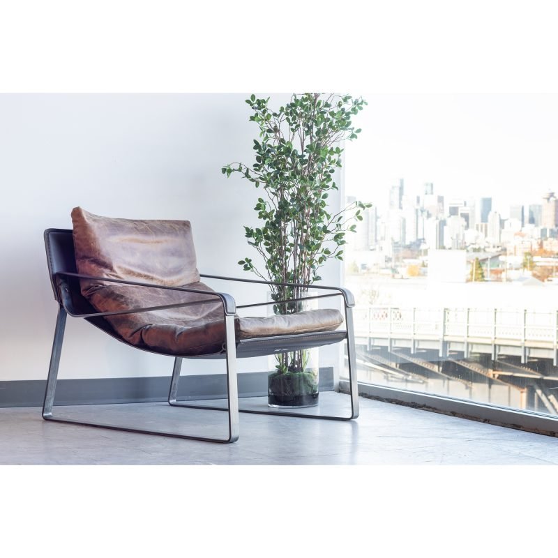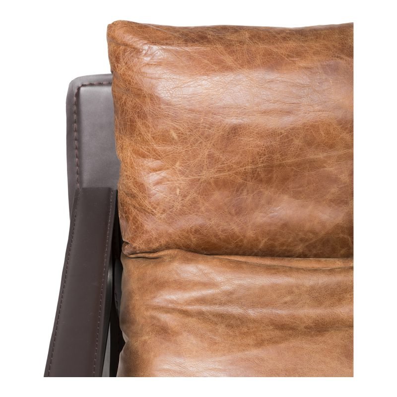 The quintessential modern classic accent chair. Enveloped in high-quality top-grain leather the Connor club chair is an indulgence in luxurious lounging with a distinctive leather sling artfully reclined for maximum relaxation. A sleek and robust iron frame imparts an industrial edge to the smooth brown leather – a harmonious blend of sculptural allure and leisurely comfort.. Dimensions: 30.75? W X 34.0? D X 27.5? H