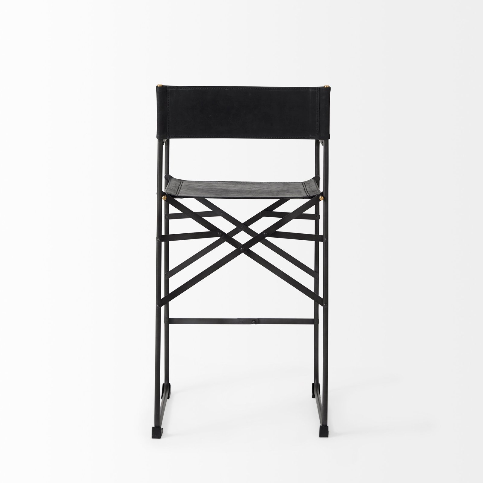 The Direttore a spectacular counter stool that is inspired by a director’s chair features a solid iron frame and is easily foldable. Featuring a classic combination of black leather and matte-black metal the Direttore makes for a great addition to living rooms based on the Industrial and Mercana Modern design style.. Dimensions: 19.3L x 19.3W x 40.2H