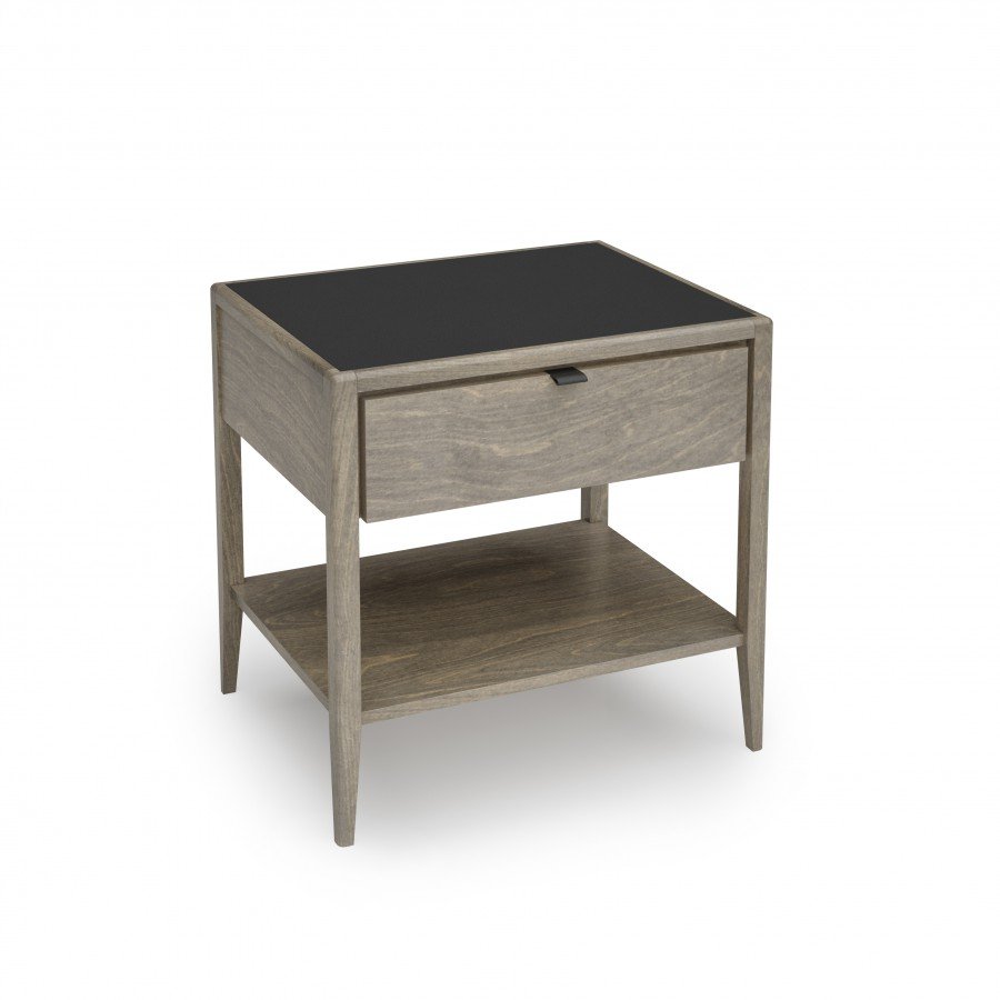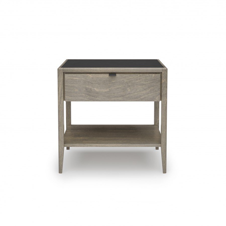 This nightstand finished on all four sides features one drawer and one lower shelf for open storage. It comes with a black synthetic leather handle and top. . Dimensions: 243/8”W x 193/8”D x 24”H