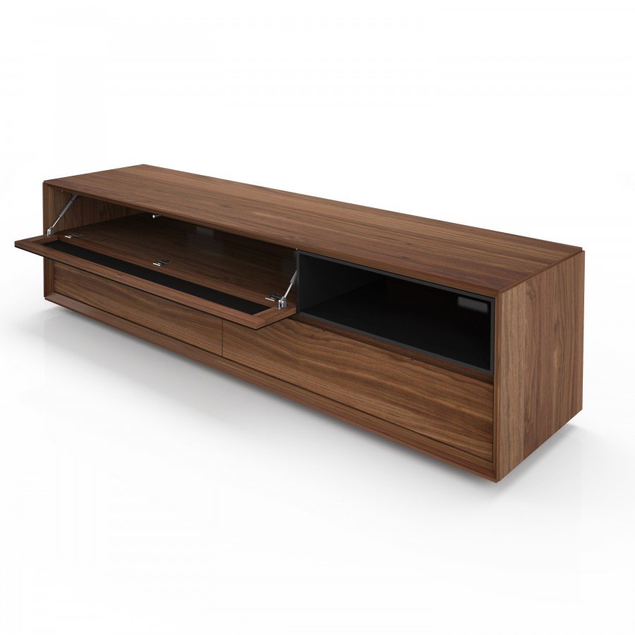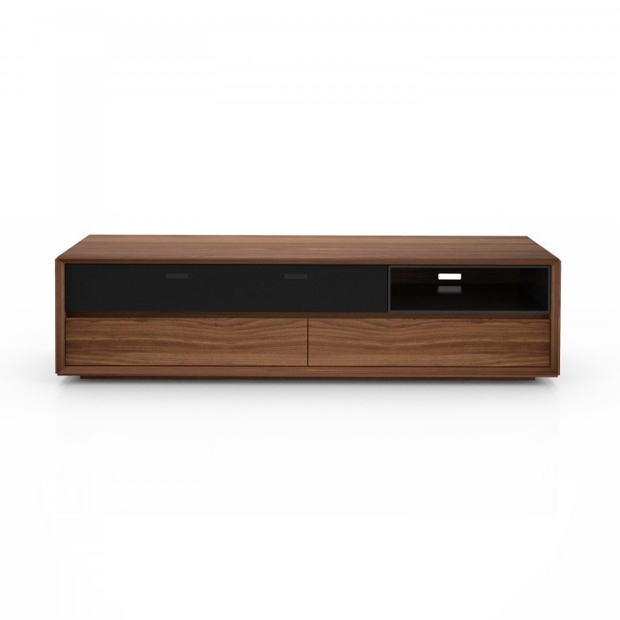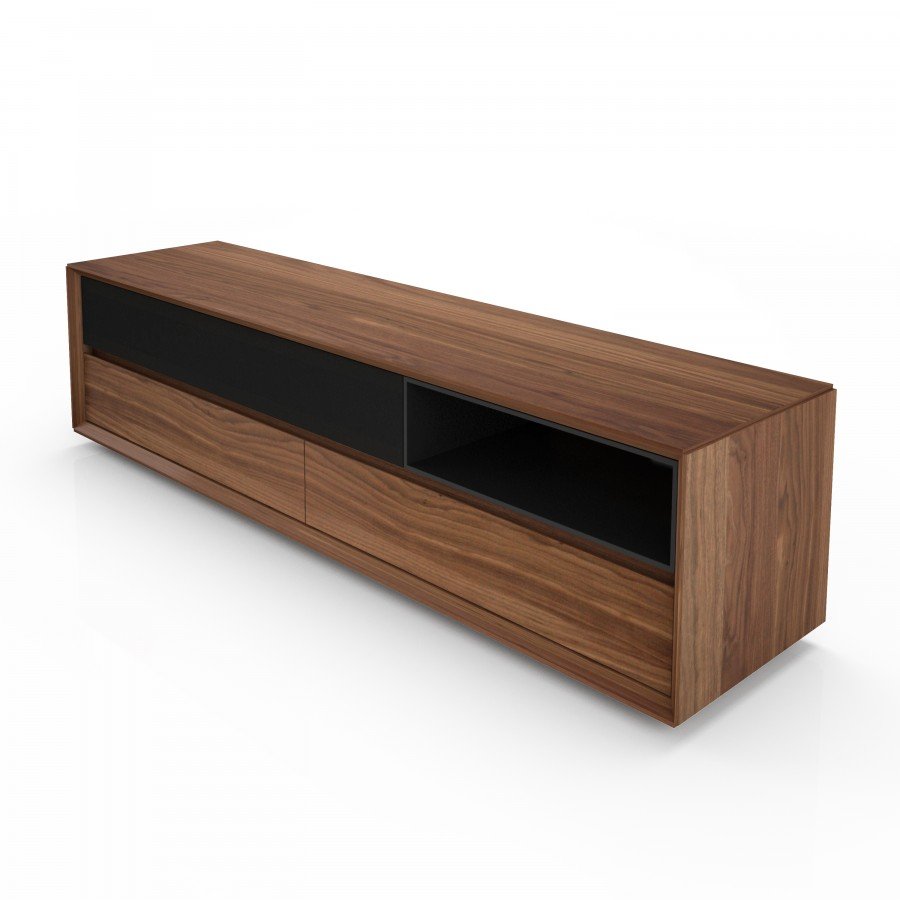 Design Joel Dupras. Made of american black walnut. 1 glass flap door 2 drawers and 1 lacquered opening. Dimensions: 78”W x 19”D x 20”H