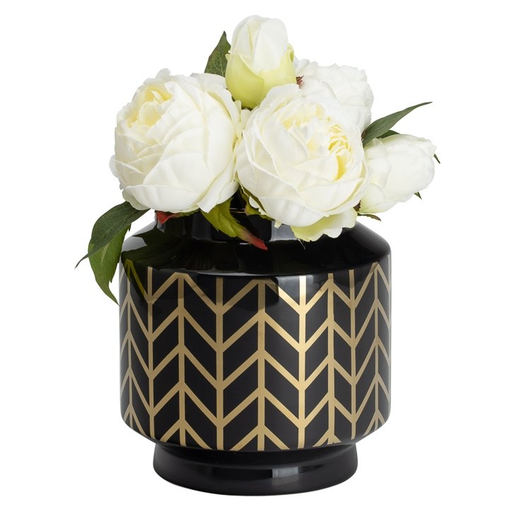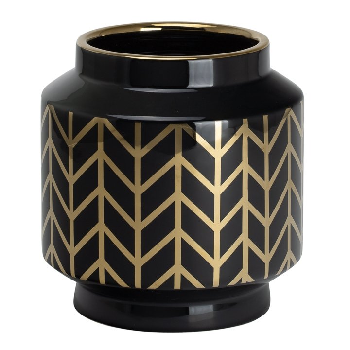 An updated take on a classic chevron pattern this stylish black ceramic vase is accented with a lux gold design. Place on a shelf or table with either a pre-potted plant or a lively bouquet of flowers to create a stunning centerpiece. The touch of gold makes this a perfect piece for events and celebrations. Dimensions: 7d x 7.5h”. Inside Dimensions 4.5d