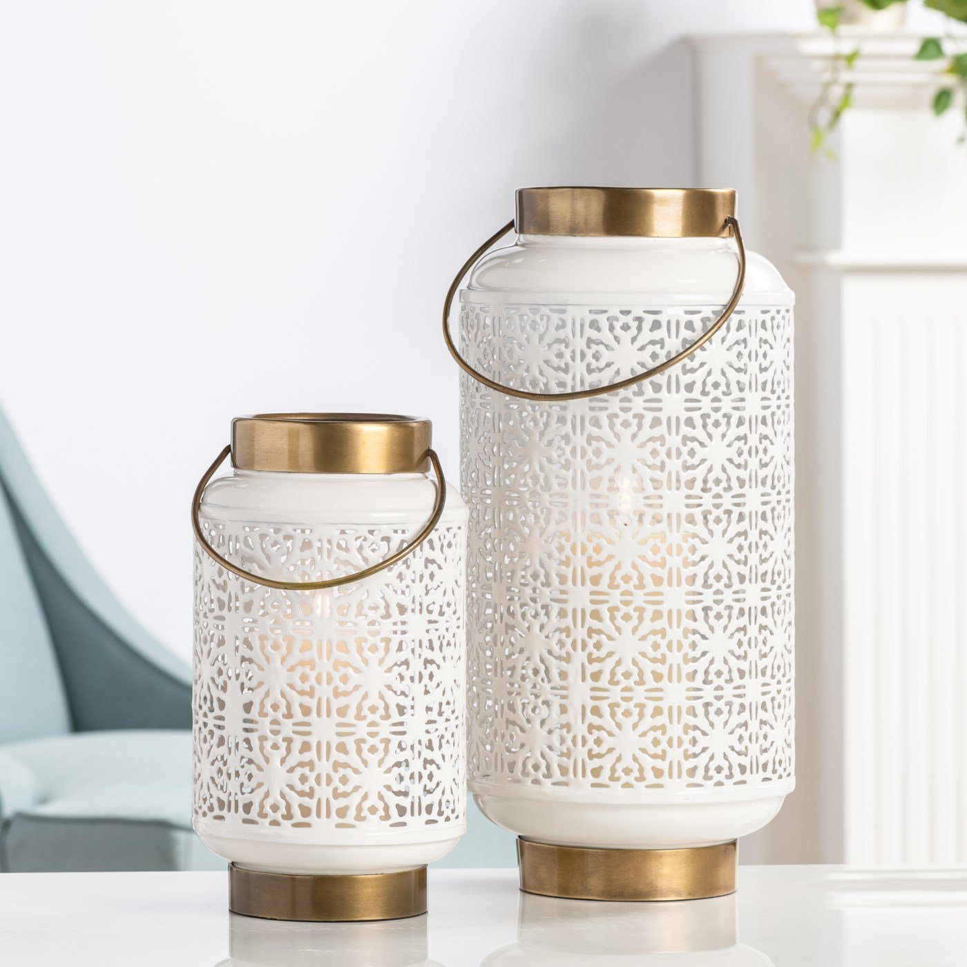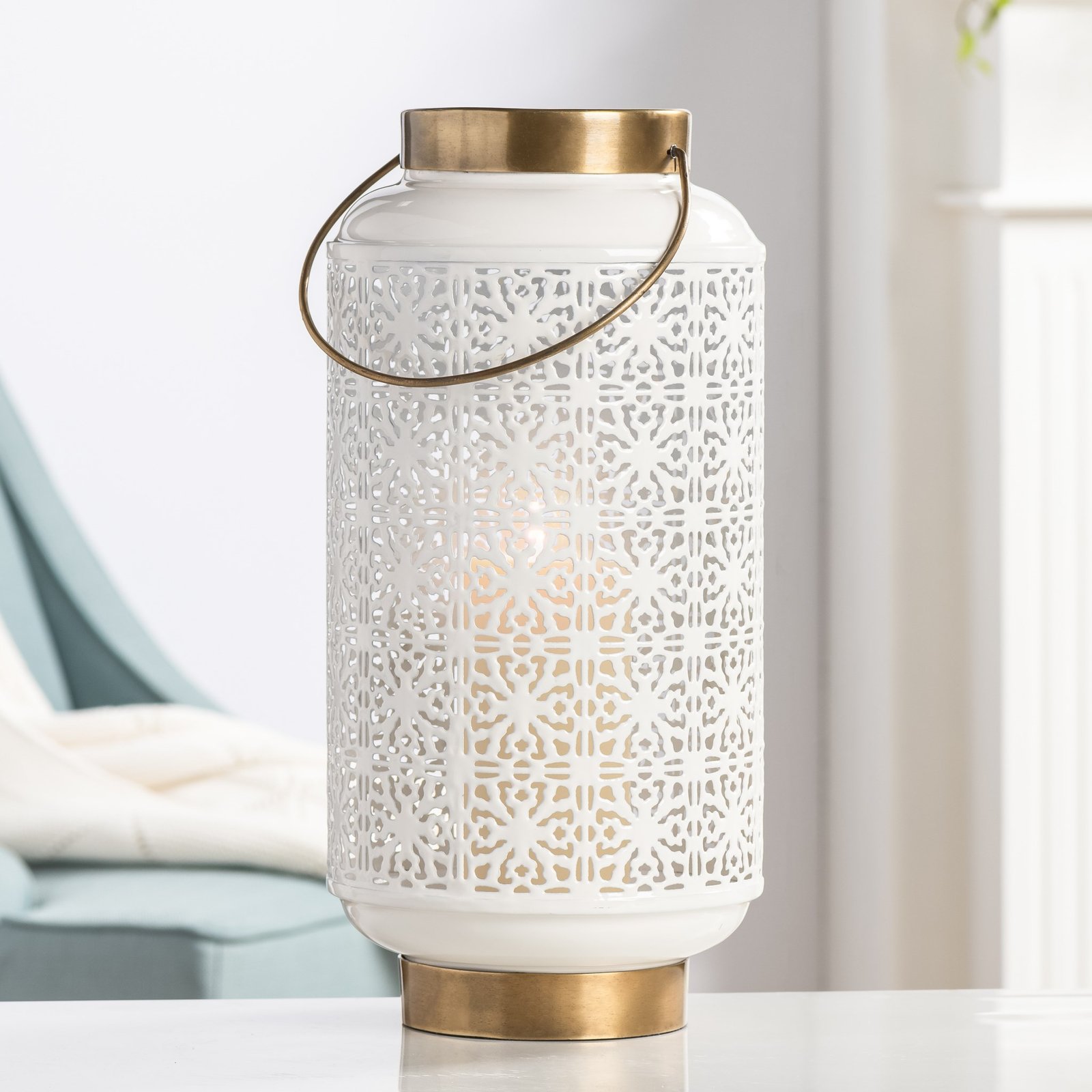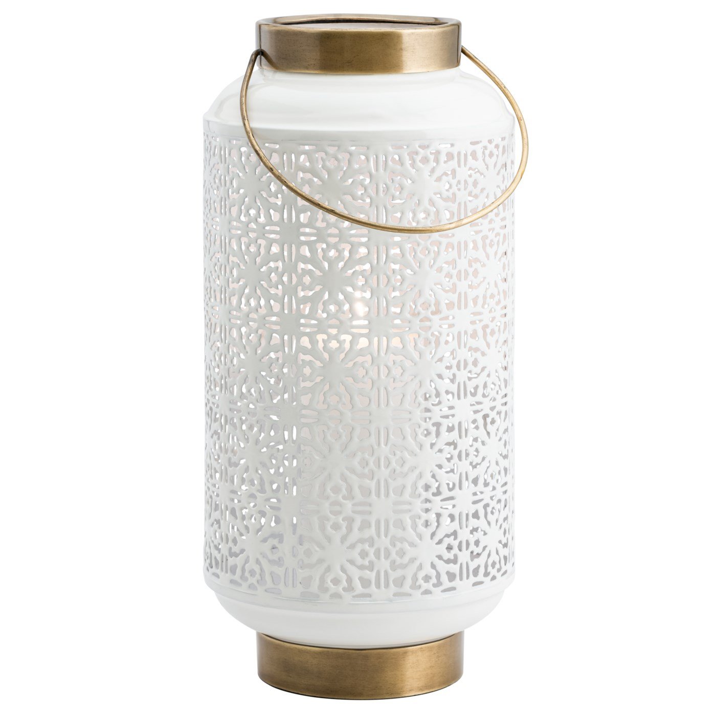 The detailed cutout features of this lantern are highlighted by a sleek white enamel finish. Paired with an antiqued handle and rim this stylish metal candle holder would add style to any space. Dimensions: 7.5d x 16h”. Fits maximum 4d” pillar candle