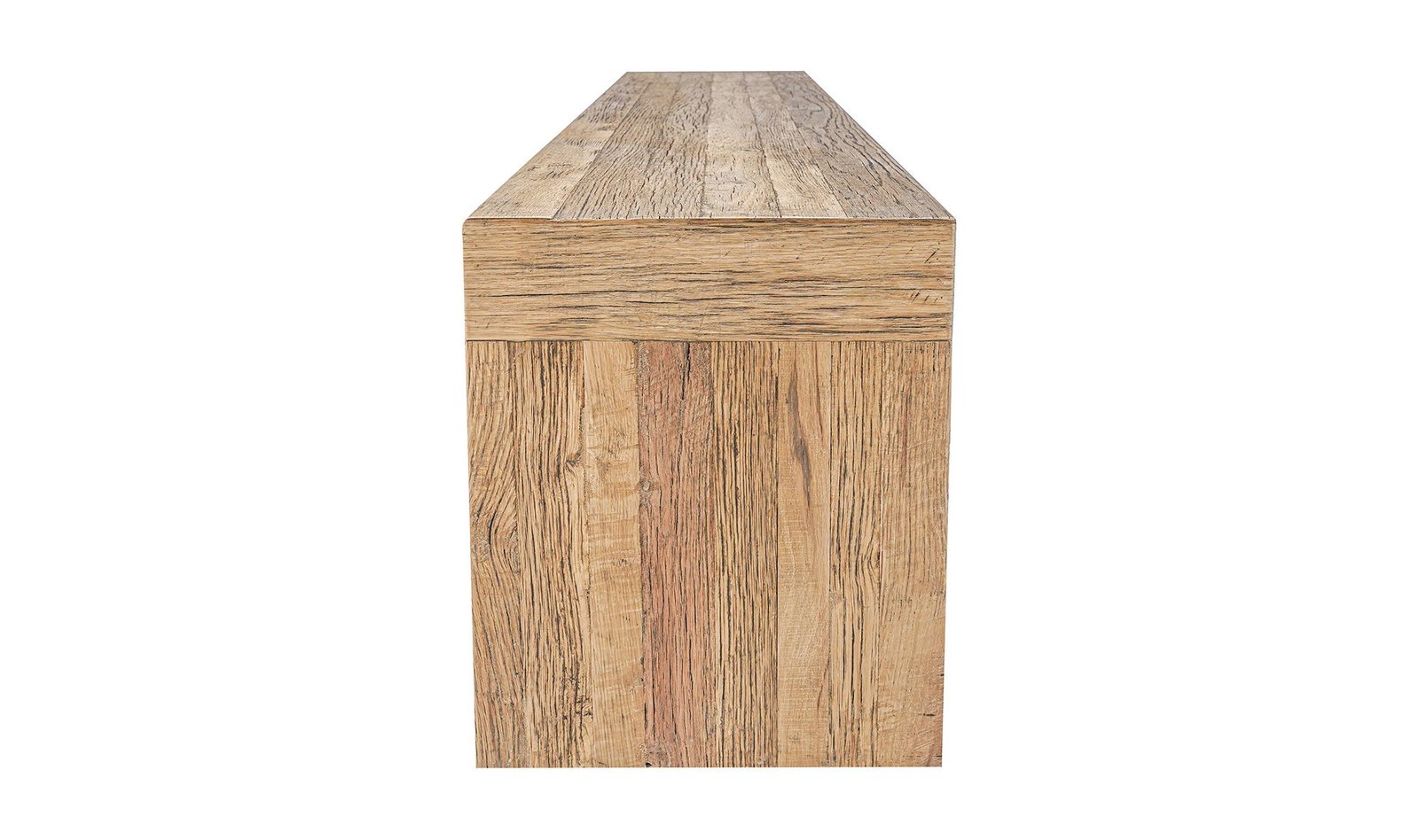 Crafted from solid reclaimed oak beautiful natural grains knots and imperfections take center stage with the Evander dining bench. Its modern blocked construction balances rustic and contemporary design with organic energy adding character and warmth to any space.. Dimensions: 77.0? W X 15.0? D X 18.75? H