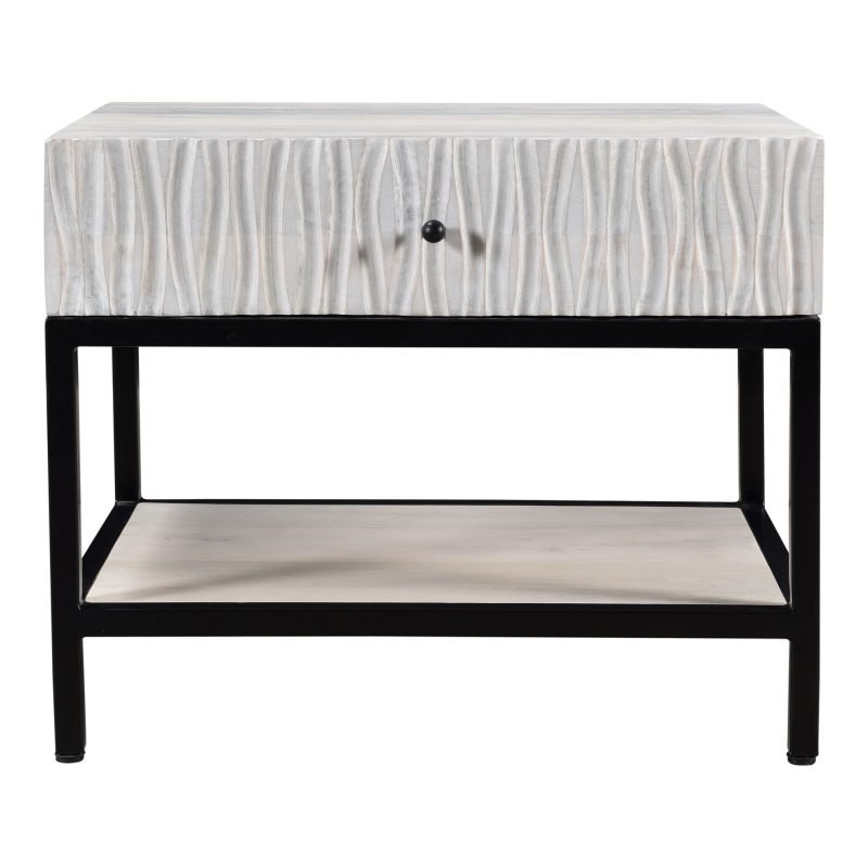 The contemporary designed Faceout nightstand is constructed with solid mango wood with the intention to last. The whitewashed finish creates a rustic effect while its powder-coated iron base provides a modern feel to any bedroom space. A single large drawer compartment and a shelf gives you an ample amount of space to store all your essentials.. Dimensions: 26.0? W X 18.0? D X 21.0? H