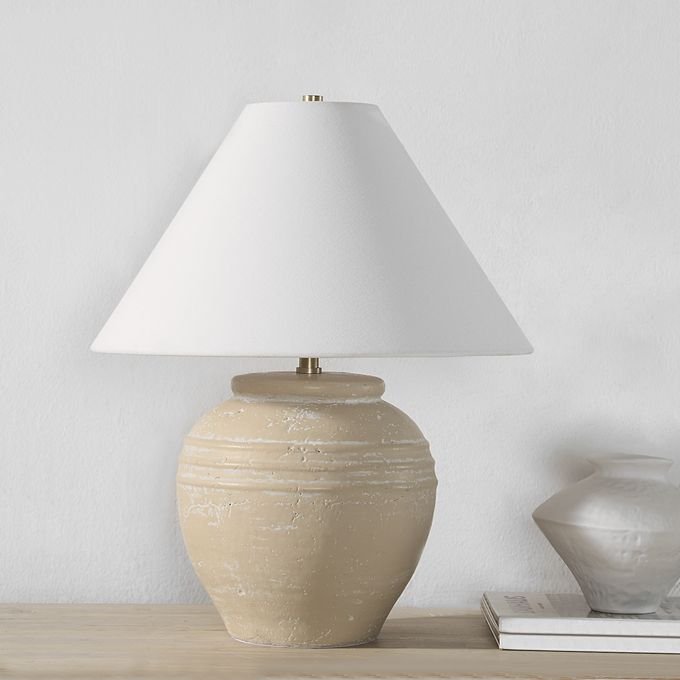 Turn on impeccable style in any room with the Fela table lamp. Featuring a richly textured hand thrown ceramic base with a cream wash painted finish for a one-of-a-kind look this dimmable lamp embodies a timeless aesthetic that?s always in fashion. Its champagne plated fitting holds an included bulb that works with the beautiful off-white tapered linen shade to diffuse ambient light for a soft and gorgeous glow in any space. Perfect as a living room lamp bedroom lamp or in just about any room it?s suitable for modern classic or rustic farmhouse interiors alike. To light up your life with sophistication and style simply plug in and switch on this stunning lamp.