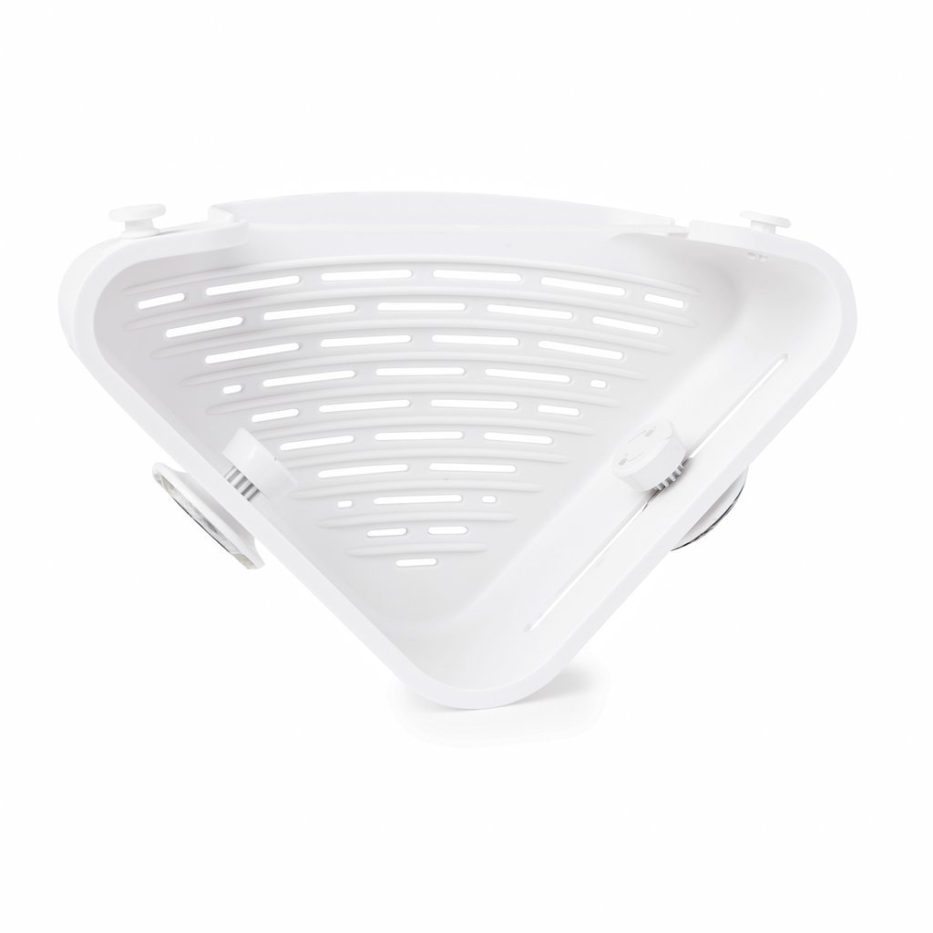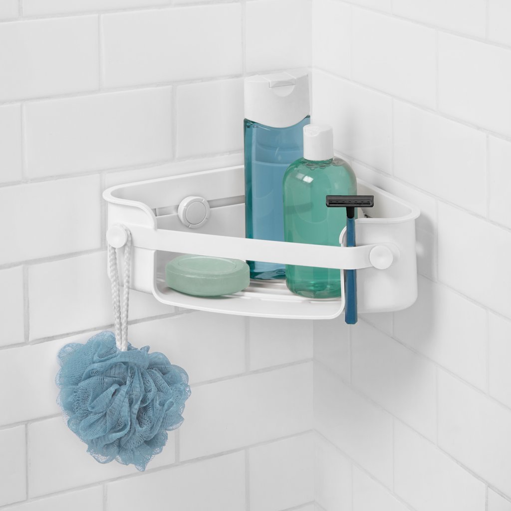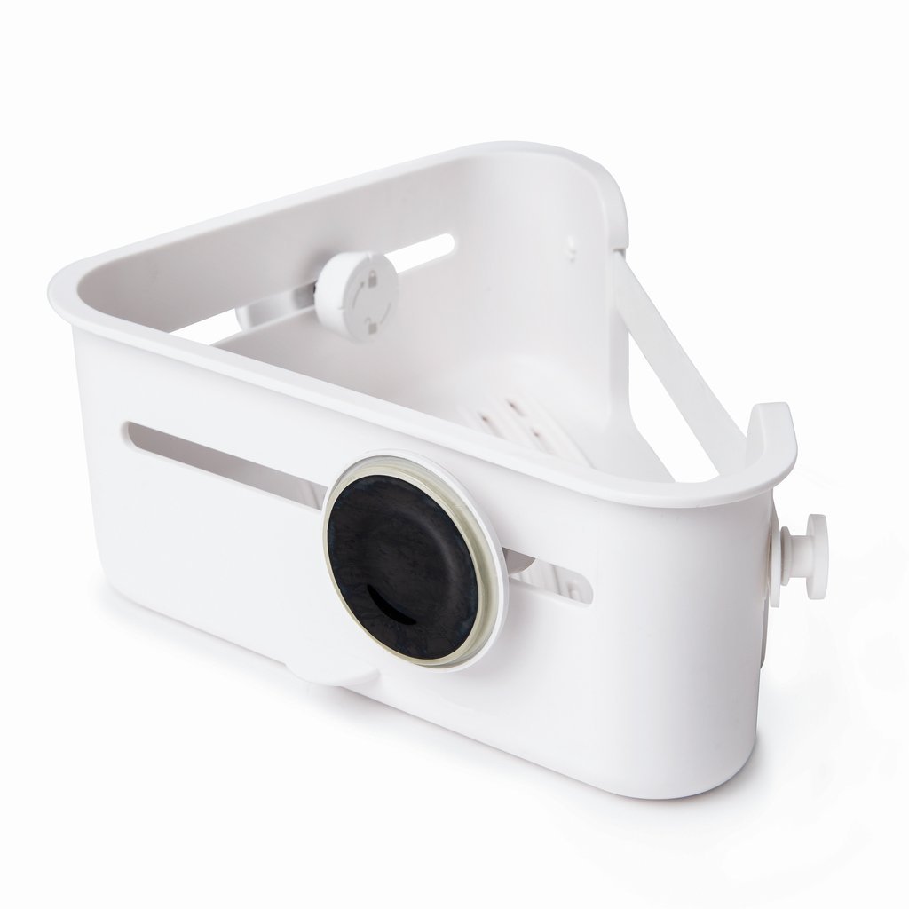 Umbra Flex Gel-Lock Corner BinFlex Gel-Lock Corner Bin makes excellent use of the underutilized corner space in your shower ? giving you more room while keeping all the essentials on hand. The unique twist to grip feature on this corner caddy allows you to lock the suction gel into place creating a vacuum seal that locks air out keeping the caddy in place even when one heavy bottle is placed on one side of the caddy. Gel-Lock Corner Bin has an integrated soap dish space for shampoo conditioner body wash a razor and two hooks for loofahs and wash cloths. It’s easy to remove and move to a different space if needed. Measures 6 ? x 10 ? x 2 ? inches (16 x 26.5 x 6 cm). For best results we recommend tightening the GEL LOCK knob once a month. Dimensions: 11.88″ (30cm)L x 7.5″ (19cm)W x 3.38″ (9cm)H