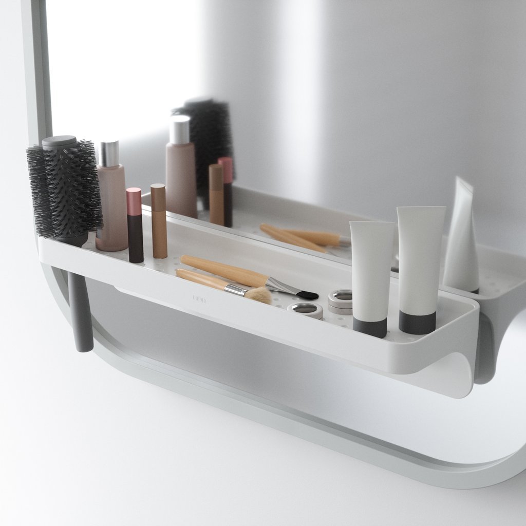 Umbra Flex Sure-Lock Bathroom Storage ShelfClearing up counter or shower space Umbra Flex Sure-Lock Shelf is a modern bathroom shelf that can be used for all types of storage. Utilizing sure-lock technology which works on smooth flat surfaces including tile glass mirrored or melamine this versatile bath shelf creates a vacuum seal grip to your chosen smooth surface for a durable hold that won?t budge. With space for bottles or bars of soap this modern bathroom shelf also has two holes for easy razor storage while its sure-lock grips also double as hooks for loofahs or face towels. Rust-proof and with integrated drainage holes Flex Sure-Lock Shelf is designed to provide elevated clutter-free storage that lasts. This easy to use storage shelf measures 17.6 x 4.9 x 3.6 inches (41.3 x 11.6 x 8.3 cm) and holds up to 10lbs (4.5 kg). Both damage and tool-free installation is painless. For best results we recommend tightening the SURE LOCK knob once a month. Dimensions: 16.38″ (42cm)L x 4.75″ (12cm)W x 3.38″ (9cm)H