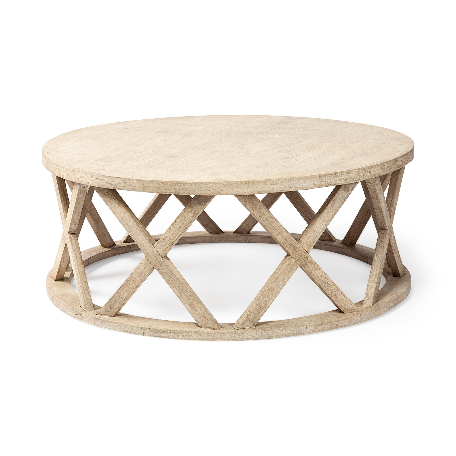 With its beautifully simplistic design and versatility to fit into most themed interiors the blonde-colored Forsey Coffee Table has been lovingly crafted out of solid mango wood showcasing a smooth finish and the wood?s beautiful grain. This coastal-inspired table features an eye-catching lattice pattern that separates a round tabletop and base and delivers a light and airy aesthetic.. Dimensions: 45.3L x 45.3W x 18.0H