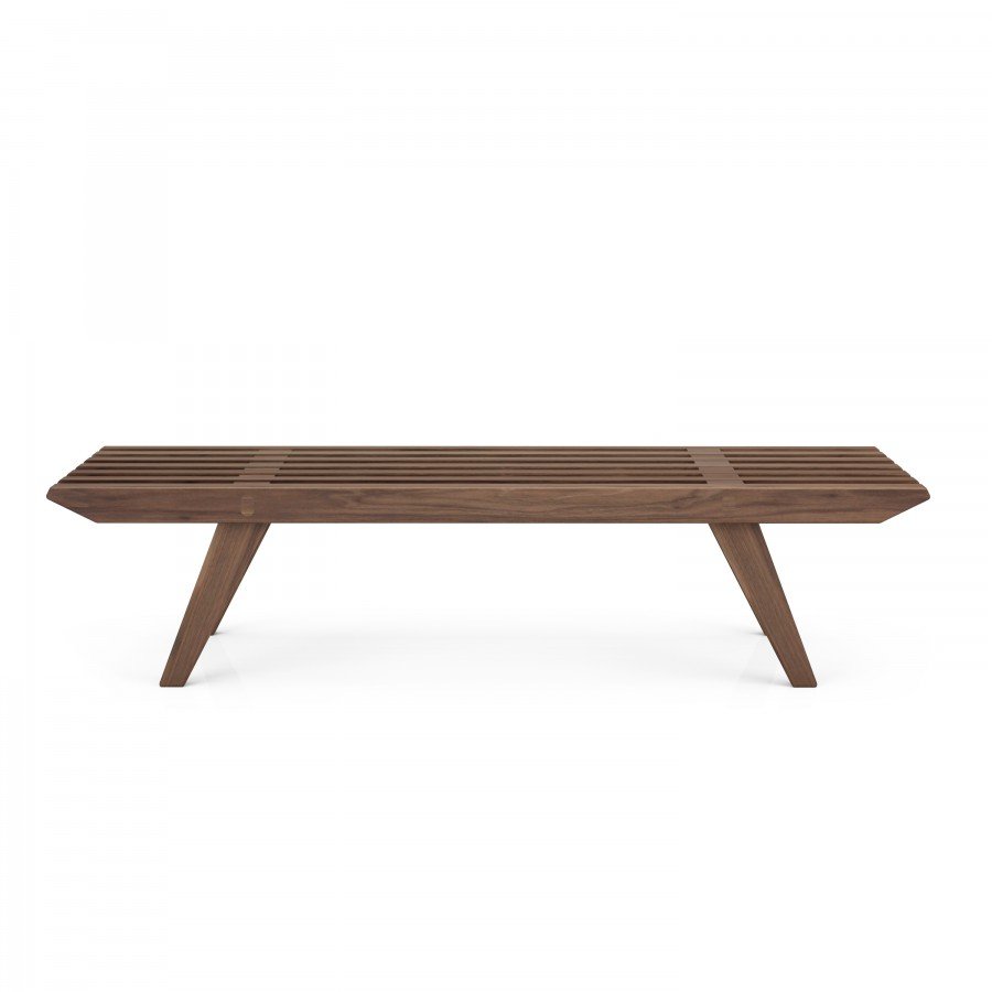 A slatted bench reminiscent of 1950s modernism with an oriental touch. . Dimensions: 60”W x 161/4”D x 161/2”H