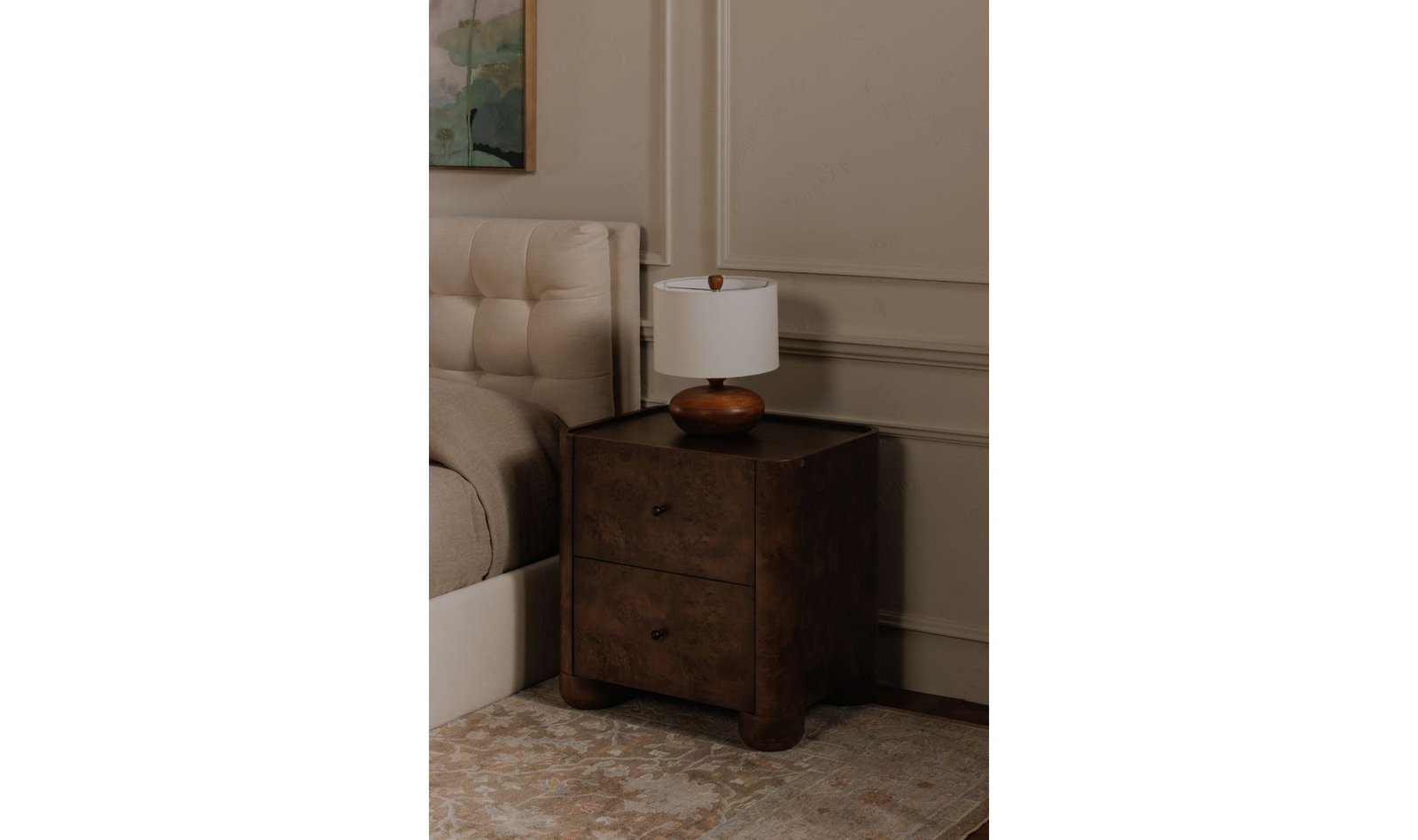 The Gibson nightstand’s fluid design seamlessly integrates the leg panel into the frame creating a captivating visual flow. Crafted from solid oak with beautifully grained burl veneer this piece marries durability with sophistication. Playful lip detailing and a soft-close drawer add unexpected charm with its timeless appeal and meticulous craftsmanship.. Dimensions: 25.98? W X 20.0? D X 25.98? H