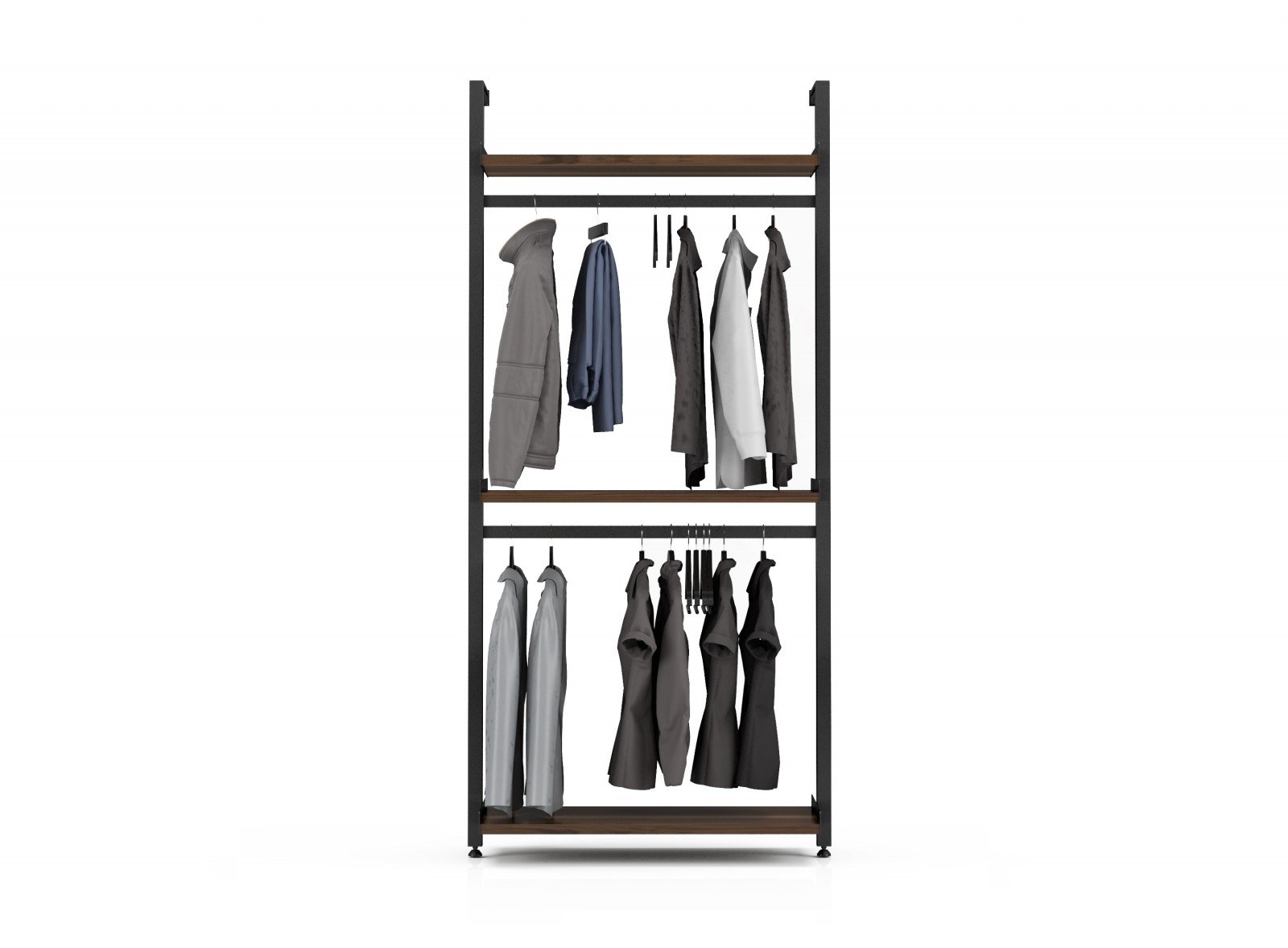 This configuration is designed to serve as a walk-in closet. The black anodized aluminum frame characteristic of the collection supports two horizontal bars for hanging clothes at different levels. The elegance of the metal harmonizes perfectly with the wooden shelves available in various types such as walnut oak birch and lacquered wood. This minimalist and functional design offers an open storage solution ideal for displaying clothes while maintaining a modern and refined aesthetic. . Dimensions: 431/2″W x 21″D x 92″H