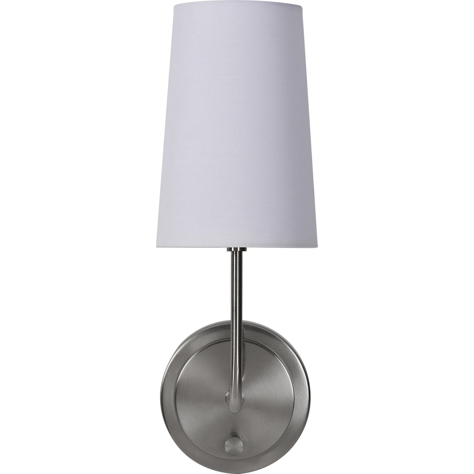 Wall SconceIronSatin Nickel Plated FinishOff-White Cotton ShadeHardwireMax. 40WE12 SocketNet Weight: 2lbs.Gross Weight: 3lbs.. Dimensions: