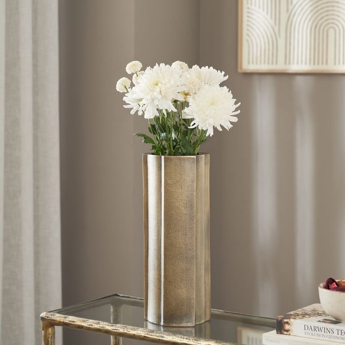 Featuring a striking antique brass-plated finish for old-world charm this sculptural vase is a perfect choice for both contemporary and transitional spaces. Handsome enough to stand on its own it also plays well with other decorative objects to create an artfully curated display.