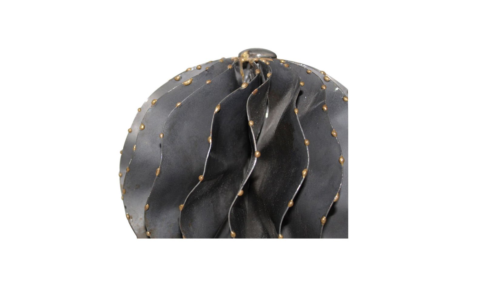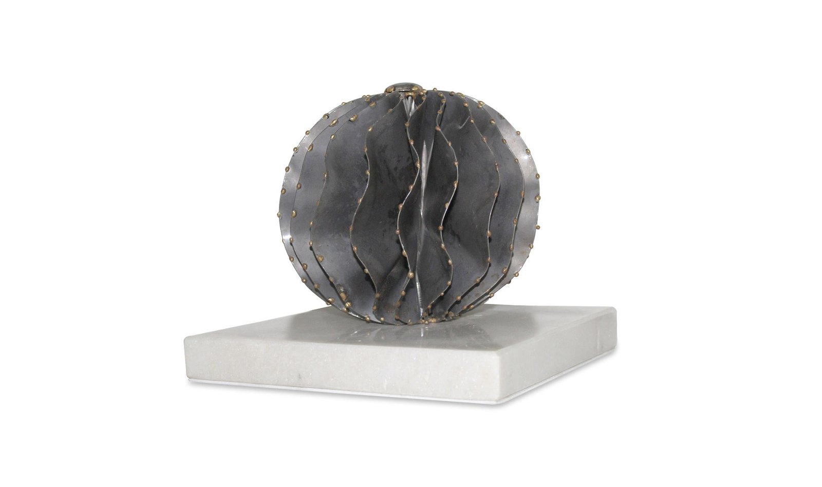 A piece perfect for additional decoration on your shelf. The Iron strips are welded together in a sphere and detailed with brass iron dots to create a magnificent orb like shape. Seamlessly fixed atop a white marble base this tabletop piece adds subtle sophistication to any room.. Dimensions: