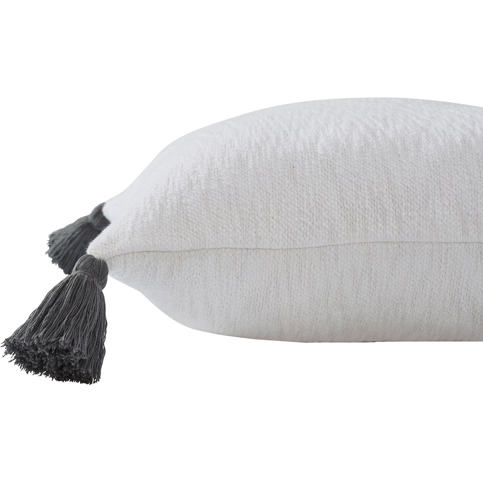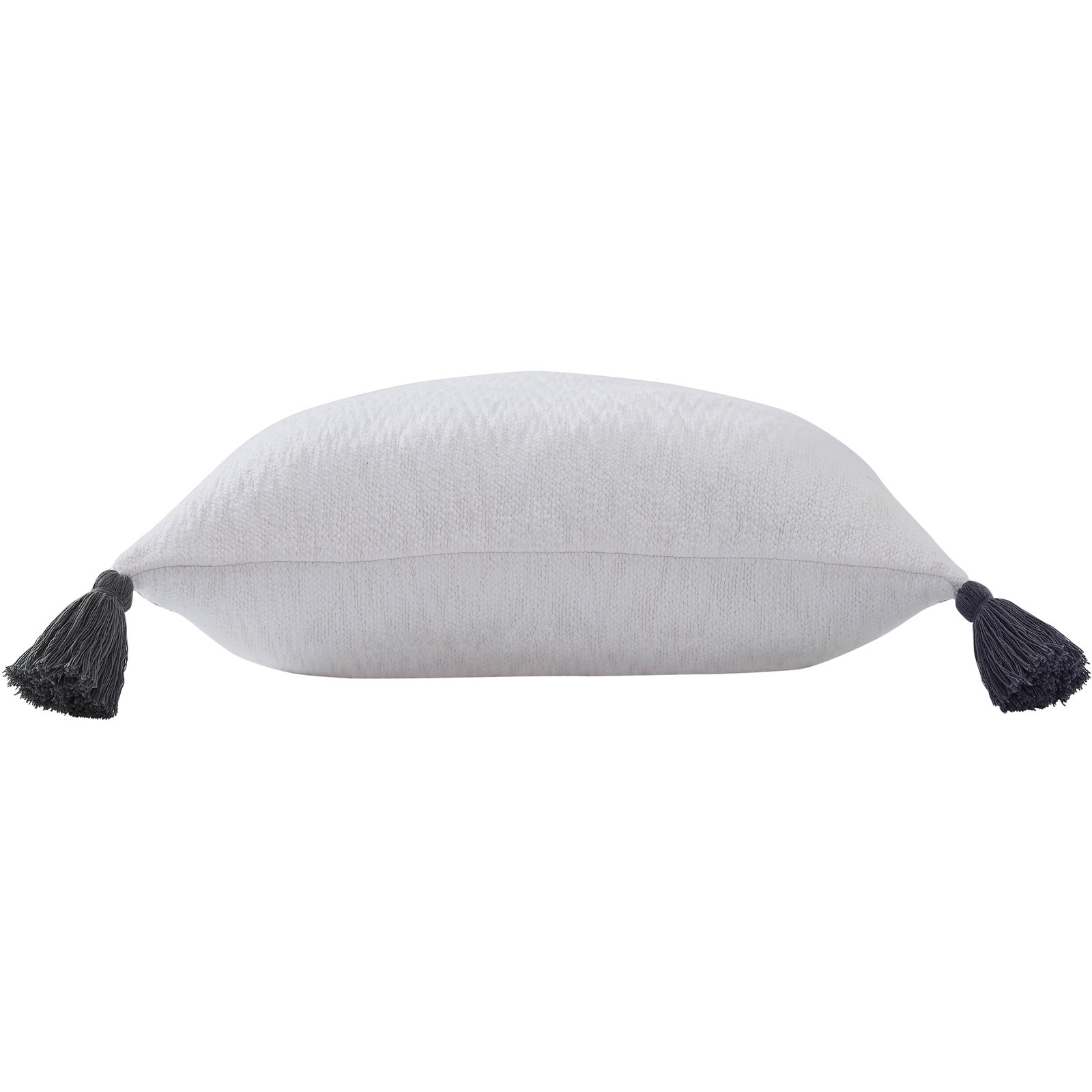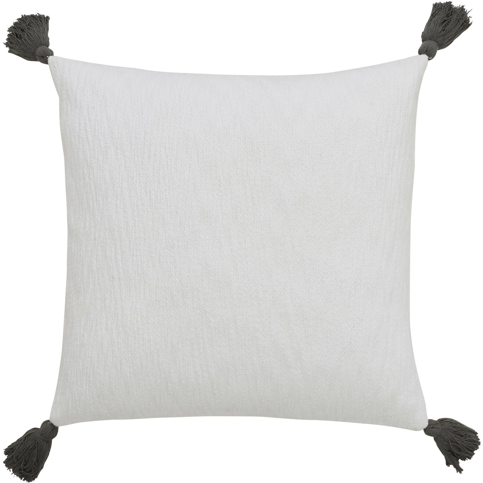 Solid with tassel cornersWhite heavy cottonCharcoal grey tassels95% feather5% down fillingNet weight: 1.2lbsFill included. Dimensions: