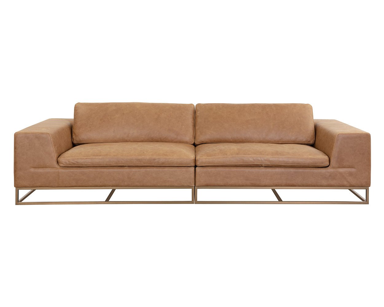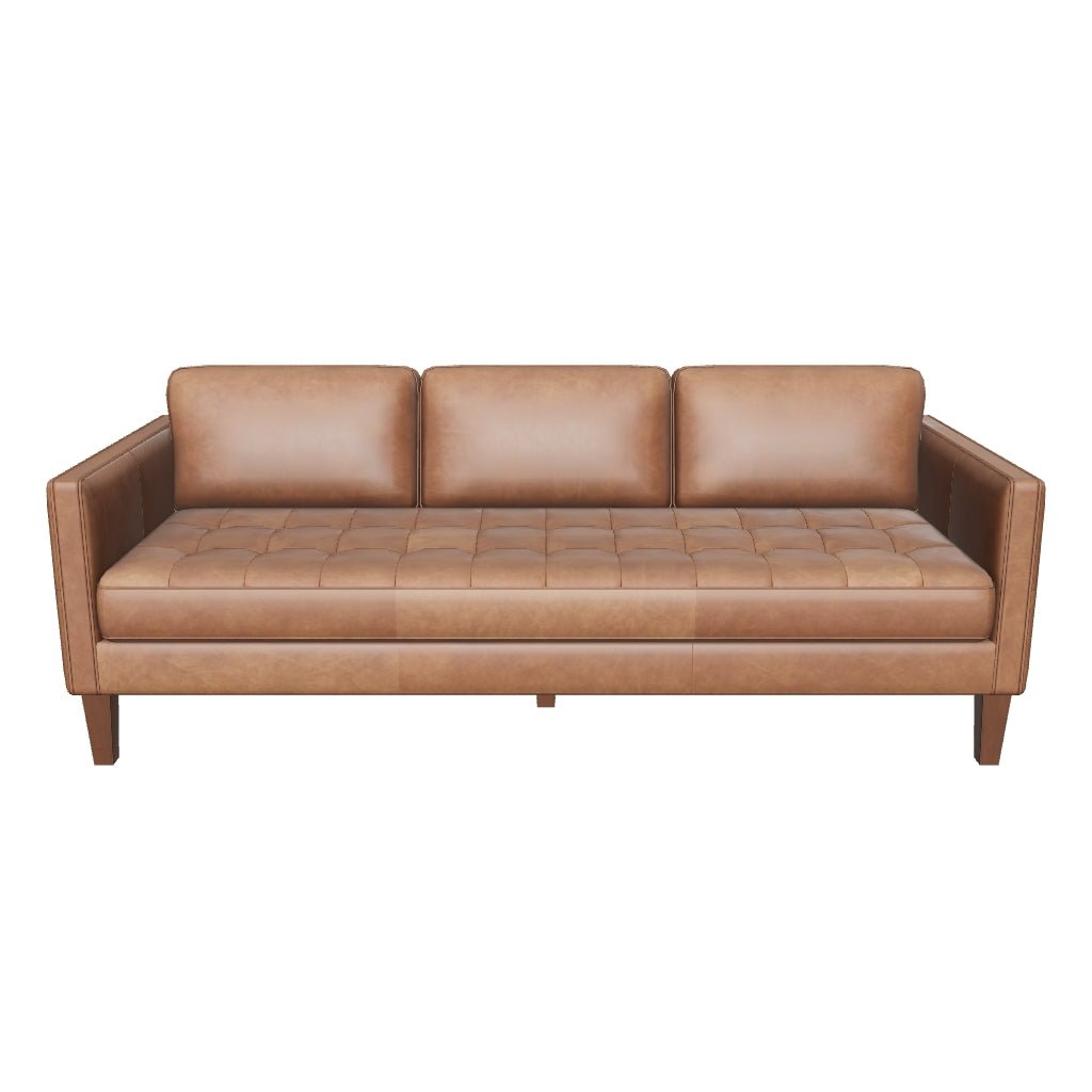 Defined by its handsome Italian-made design this timeless sofa exudes quality and comfort. Crafted from 100% Italian bovine leather in a rich cognac for a vintage look that will enhance with age. This fine material is a natural grain aniline leather that is dyed using traditional methods resulting in consistent and even colouring throughout the piece. Finished with dark brown solid beech wood legs. Coordinating armchair also available. Also stocked in barrel-dyed vintage charcoal leather. Handle with Care: This design has been crafted with 100% leather. Leather is a natural material; as such colour variations markings wrinkles grooves and light scratches are acceptable and appreciated characteristics. No two pieces are alike. Visit our Product Care page for more information on how to ensure the lasting beauty of this piece. Dimensions: 87″W x 35″D x 33″H