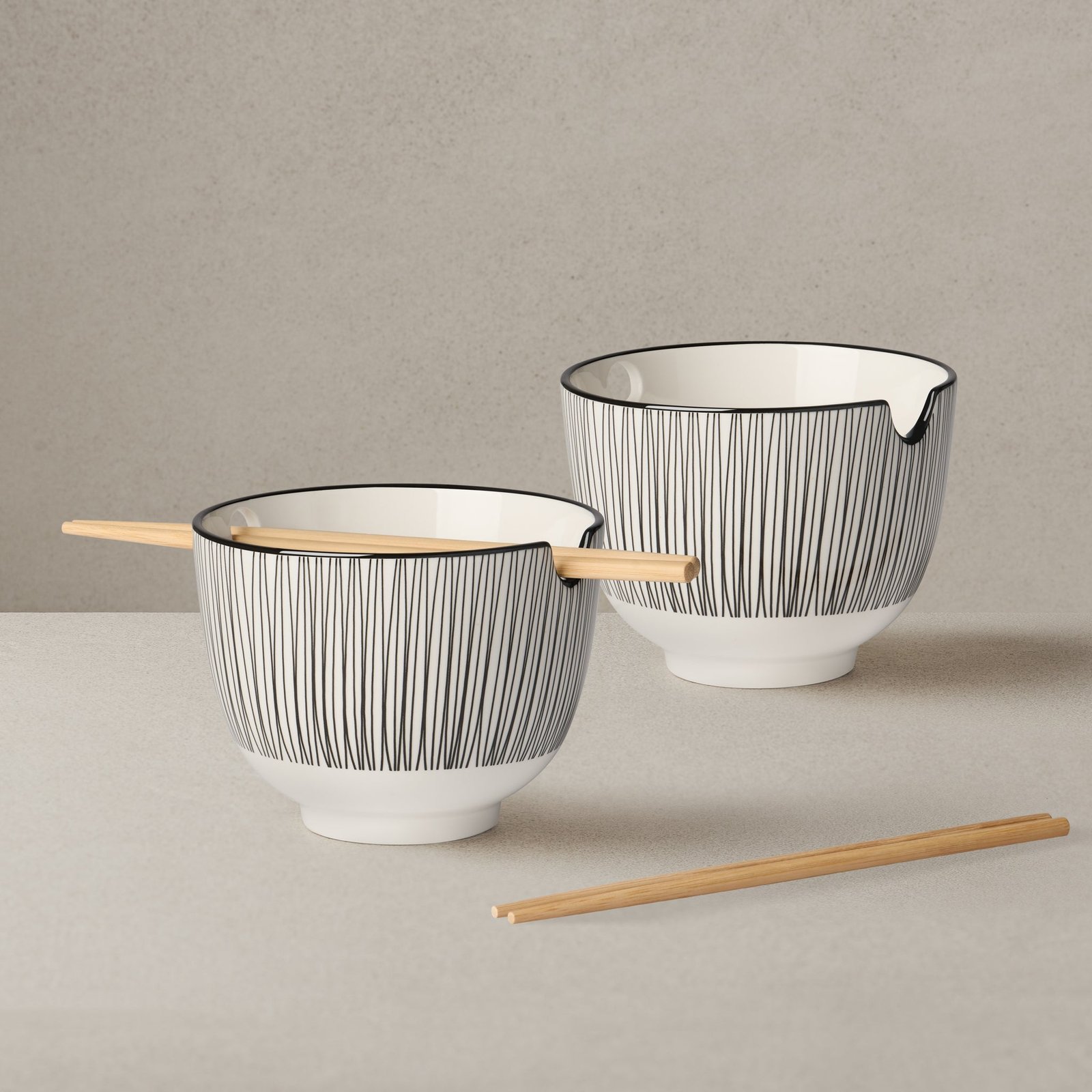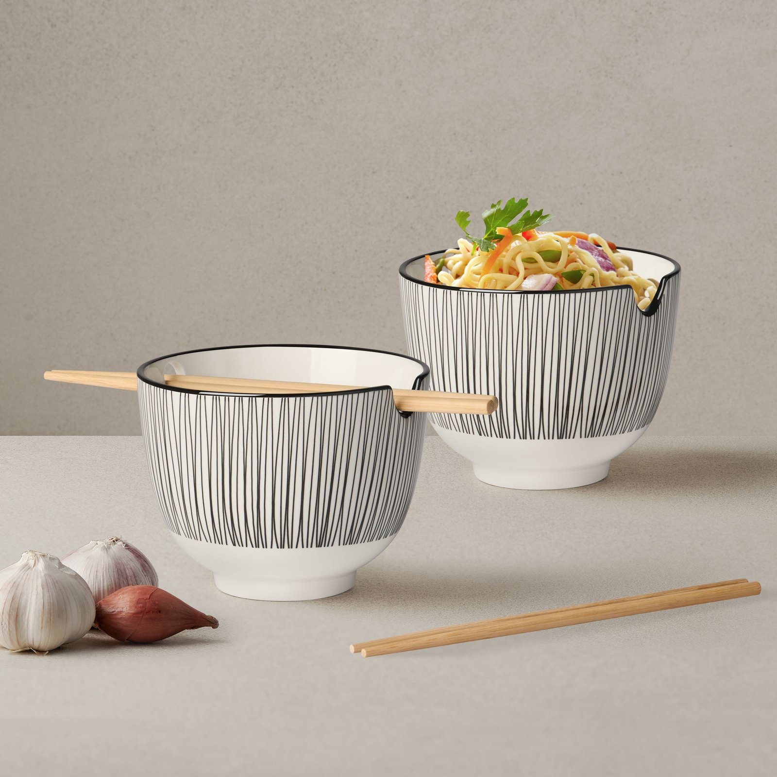 Update your Kiri Collection with our porcelain noodle bowl set featuring two bowls complete with chopsticks. Designed with a hip patterned motif these bowls add a modern twist to your dining table. Crafted from high-quality porcelain they are not only visually appealing but also durable and perfect for enjoying your favorite ramen or stir-fried noodles. Dimensions: Each. 5d x 4h