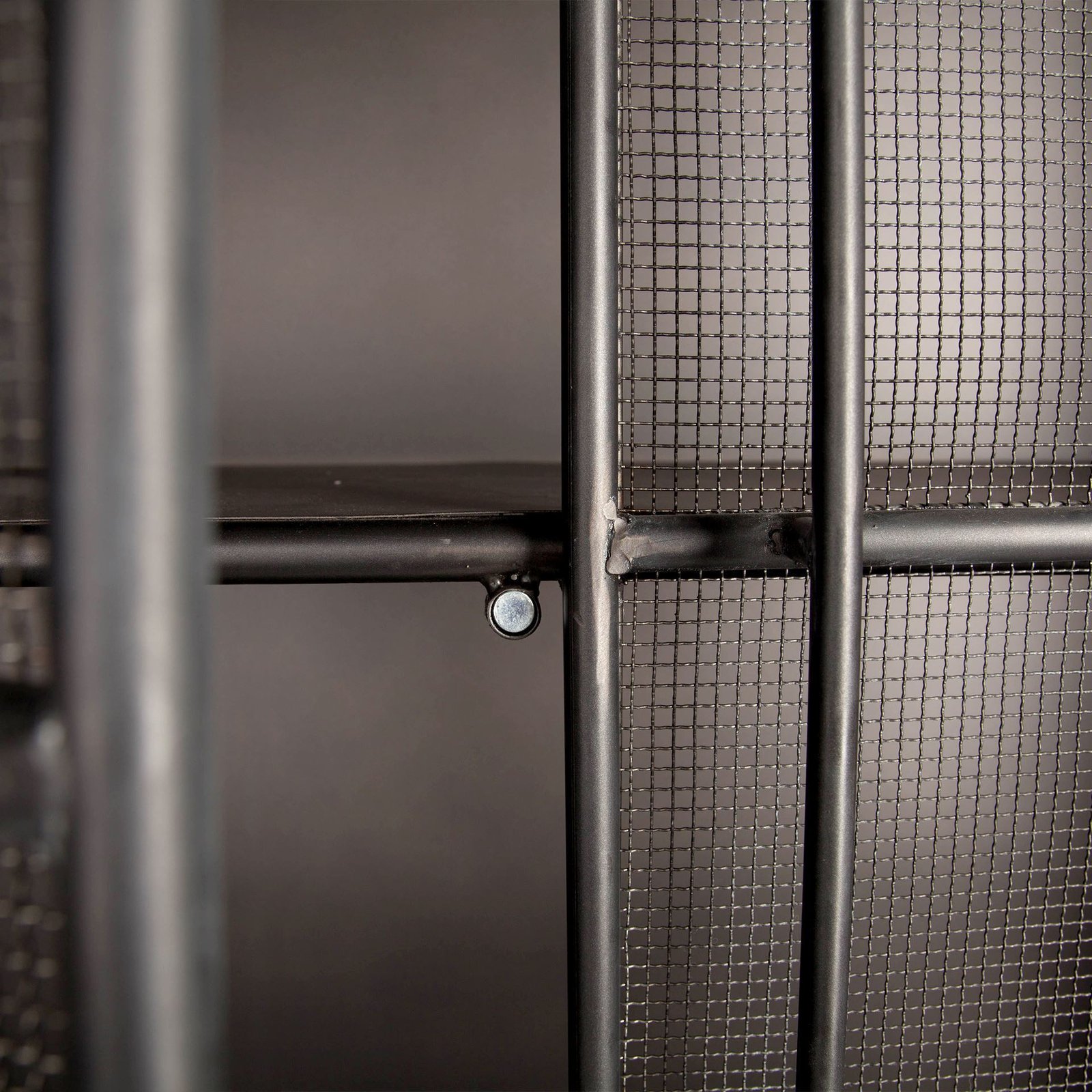 Featuring uniquely styled mesh doors the Klaus is a full-size metal storage cabinet with two fixed shelves. Finished in charcoal grey with open storage space on the bottom the Klaus is not only functional but also an eye-catching piece in any room. The versatility of the piece lets it be used to store items such as linens accessories or your favorite crockery.. Dimensions: 43.3L x 17.3W x 74.5H