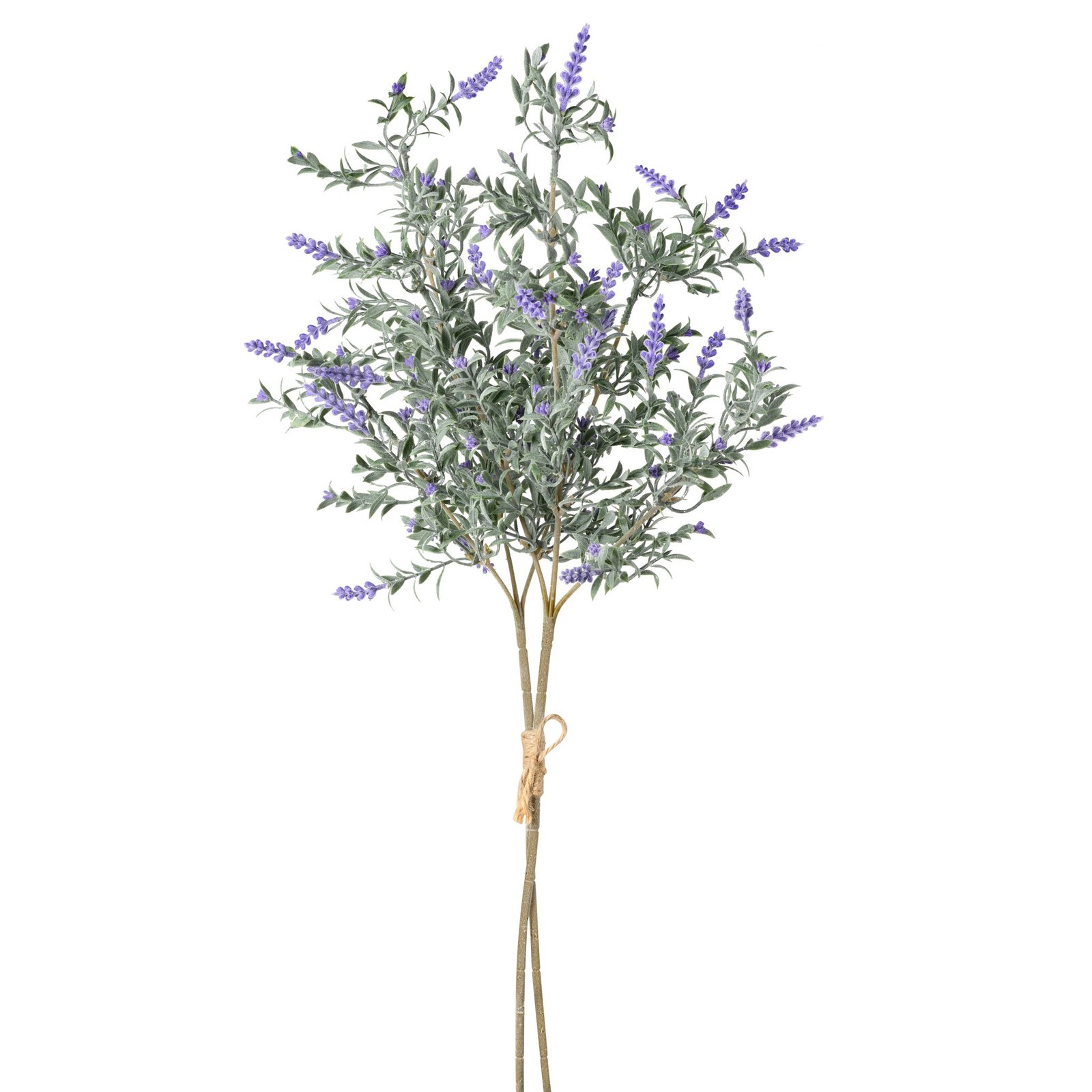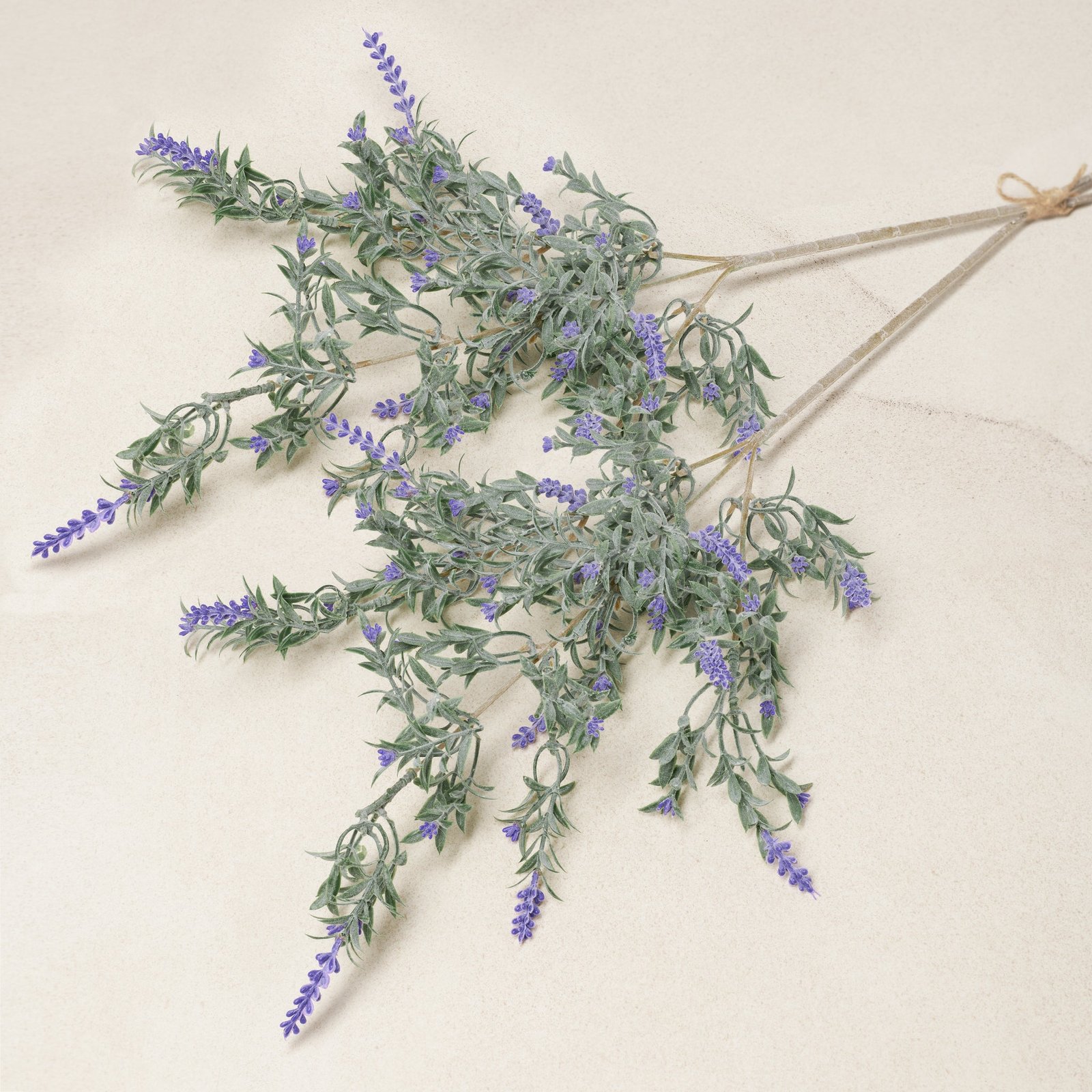 This realistic faux lavender bouquet features two stems tied with jute string and delicate lifelike blooms bringing a soothing touch of nature to any room. The soft purple hues and detailed design make it a calming accent for your decor. Perfect for adding a pop of color to small vases or as a standalone piece it offers lasting beauty with minimal upkeep. Dimensions: Overall Length 28″. Approx. 9″ widt