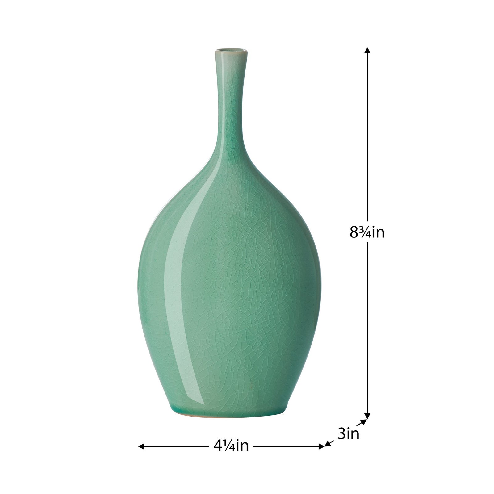 Brighten up your space with this delightful ceramic bud accent vase. The small size makes this set ideal for placement on a shelf or desk in the living room or den especially for small apartments or lofts. Fill with a fresh bloom and place on the bedside table in the bedroom to bring joy and tranquility to your morning or liven up the kitchen by placing this decorative accessory on the window ledge. The unique celadon green crackle finish ensures this elegant ceramic vase will fit in seamlessly with any home decor from rustic farmhouse to traditional to modern contemporary. Perfect for weddings garden parties or other events this charming mini vase can be filled with coordinating florals or stems to create beautiful centerpieces. Dimensions: 4.25 x 3 x 8.75h”. Vase Mouth. 1d